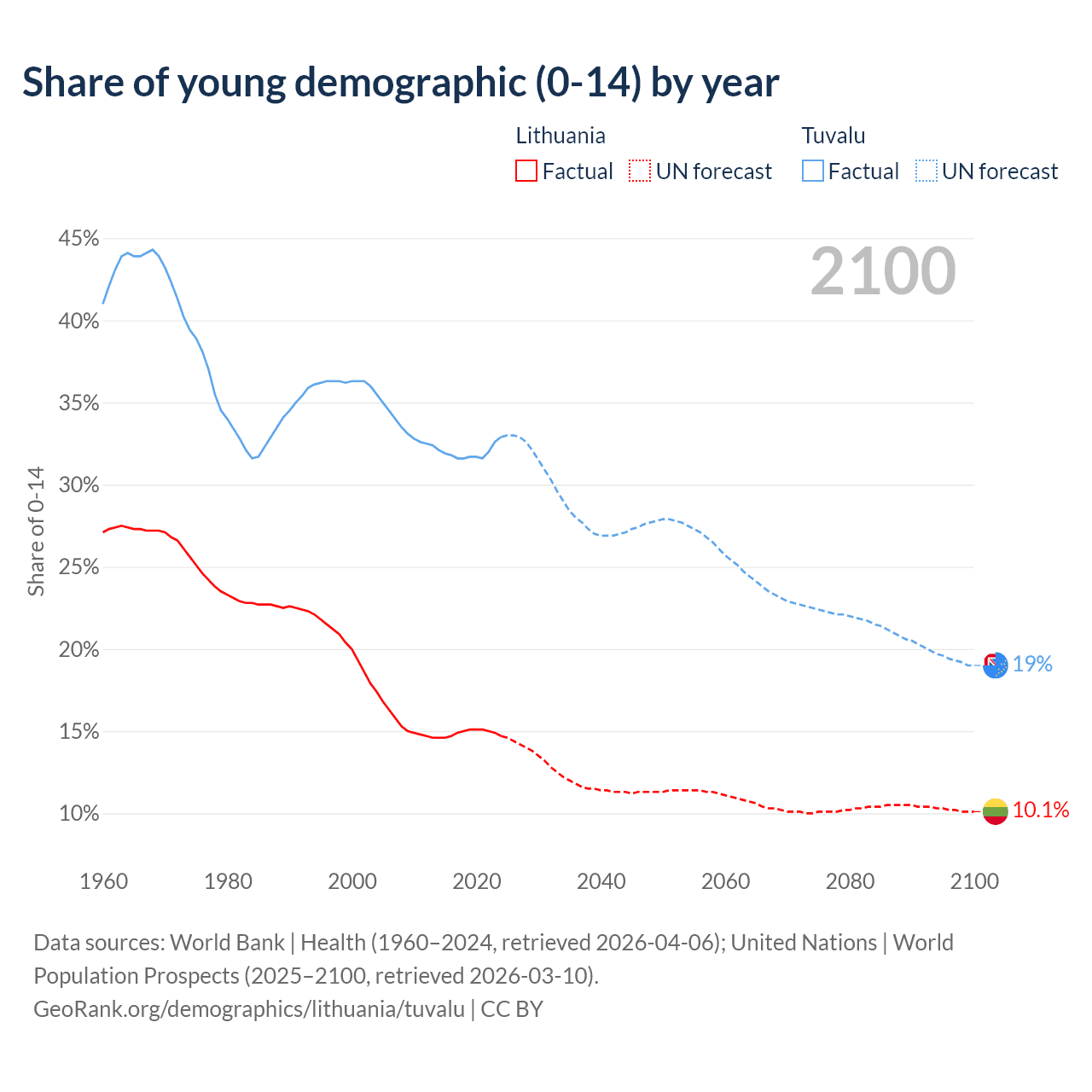 - The share of young demographic (0-15 years old) in Lithuania is 14.7% vs 32.9% in Tuvalu.