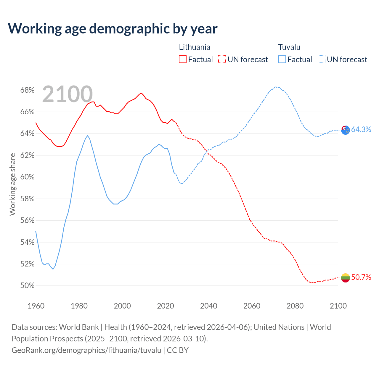 Median age Lithuania vs Tuvalu, 1960-2100