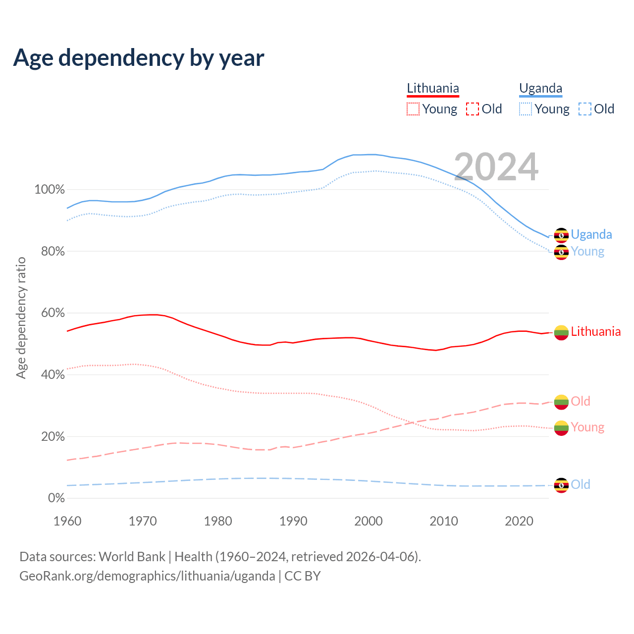 The share of older people aged 65 and over is 20.2% in Lithuania and 2.19% in Uganda. Life expectancy in Lithuania compared to Uganda .