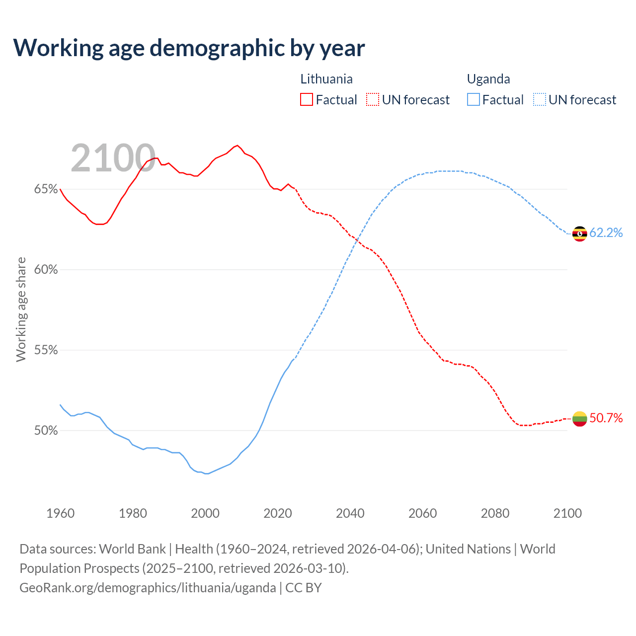 - Lithuania has 1.84M working age adults (aged 15-64) vs 28.9M in Uganda.