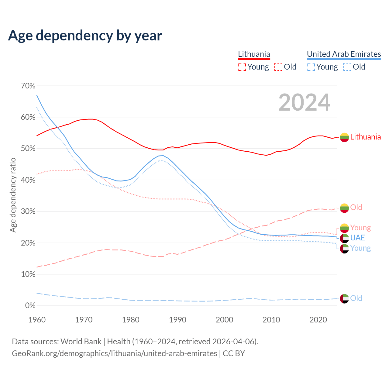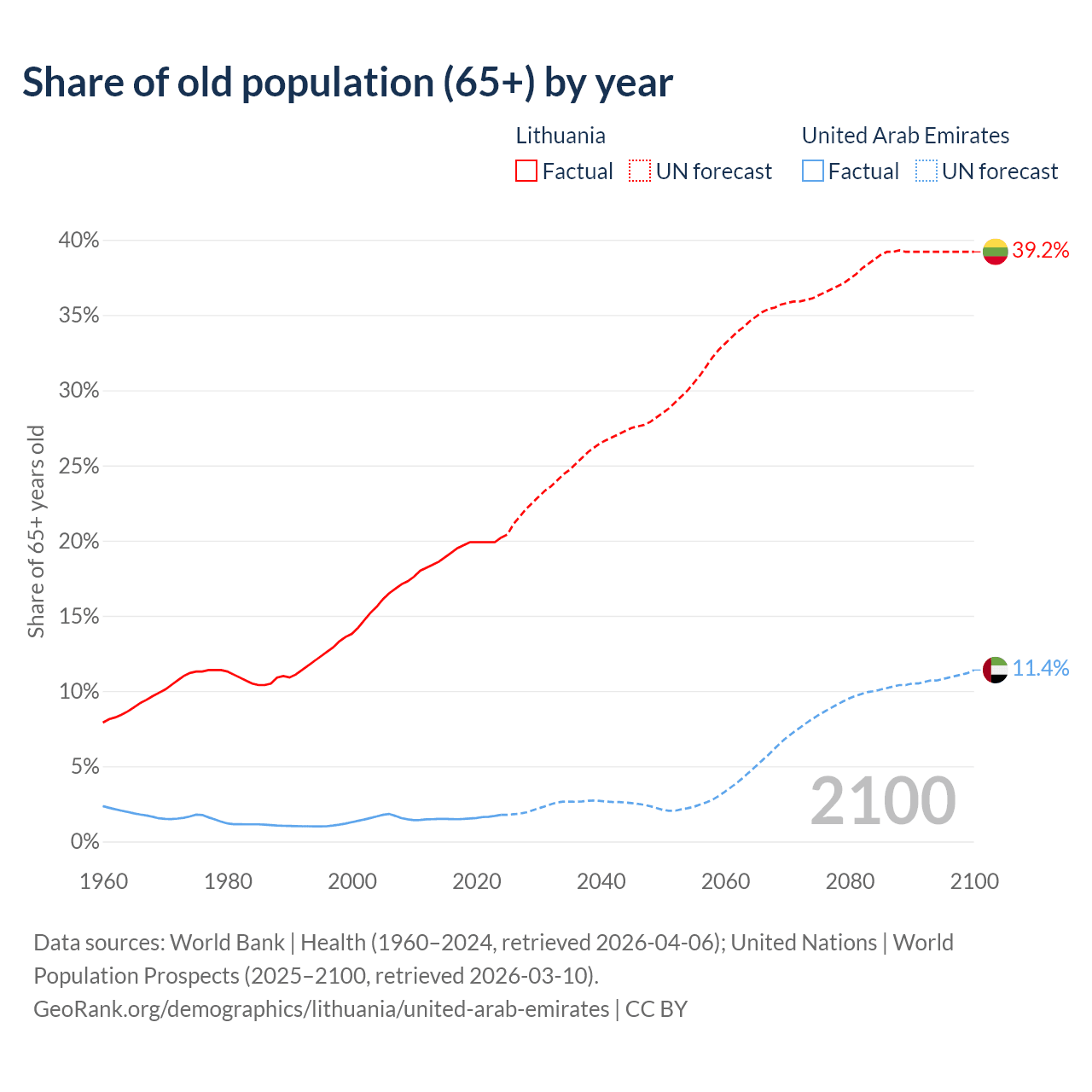 - The share of old-age demographic (65+) in Lithuania is 20.2% vs 1.77% in the United Arab Emirates.