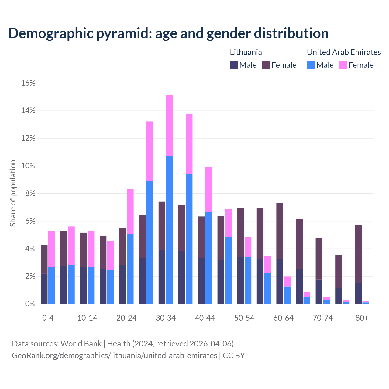 The share of older people aged 65 and over is 20.2% in Lithuania and 1.77% in the United Arab Emirates. Life expectancy in Lithuania compared to the United Arab Emirates .