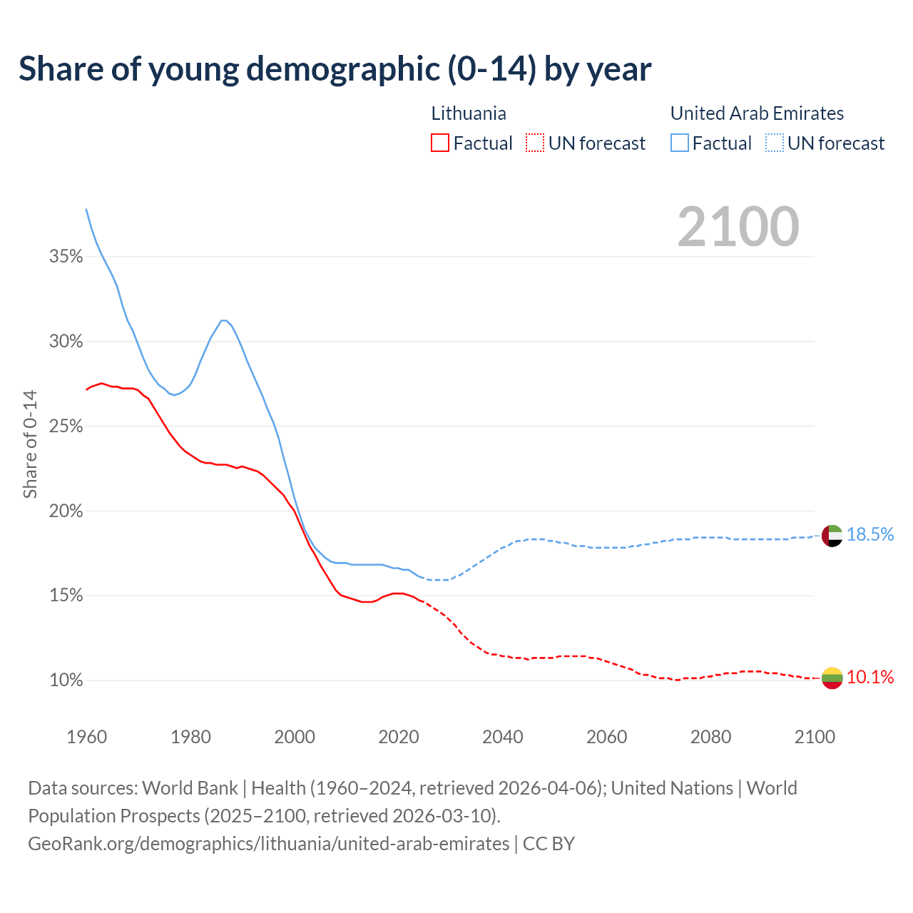 - The share of young demographic (0-15 years old) in Lithuania is 14.7% vs 16.1% in the United Arab Emirates.