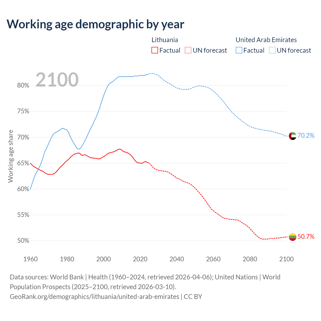 - Lithuania has 1.84M working age adults (aged 15-64) vs 9.6M in the United Arab Emirates.