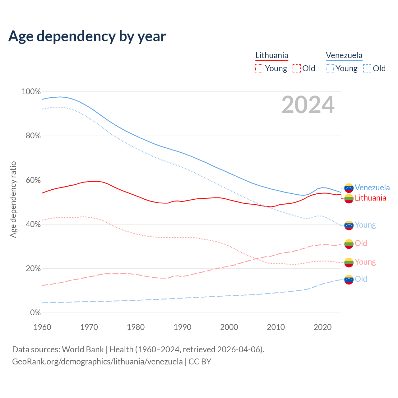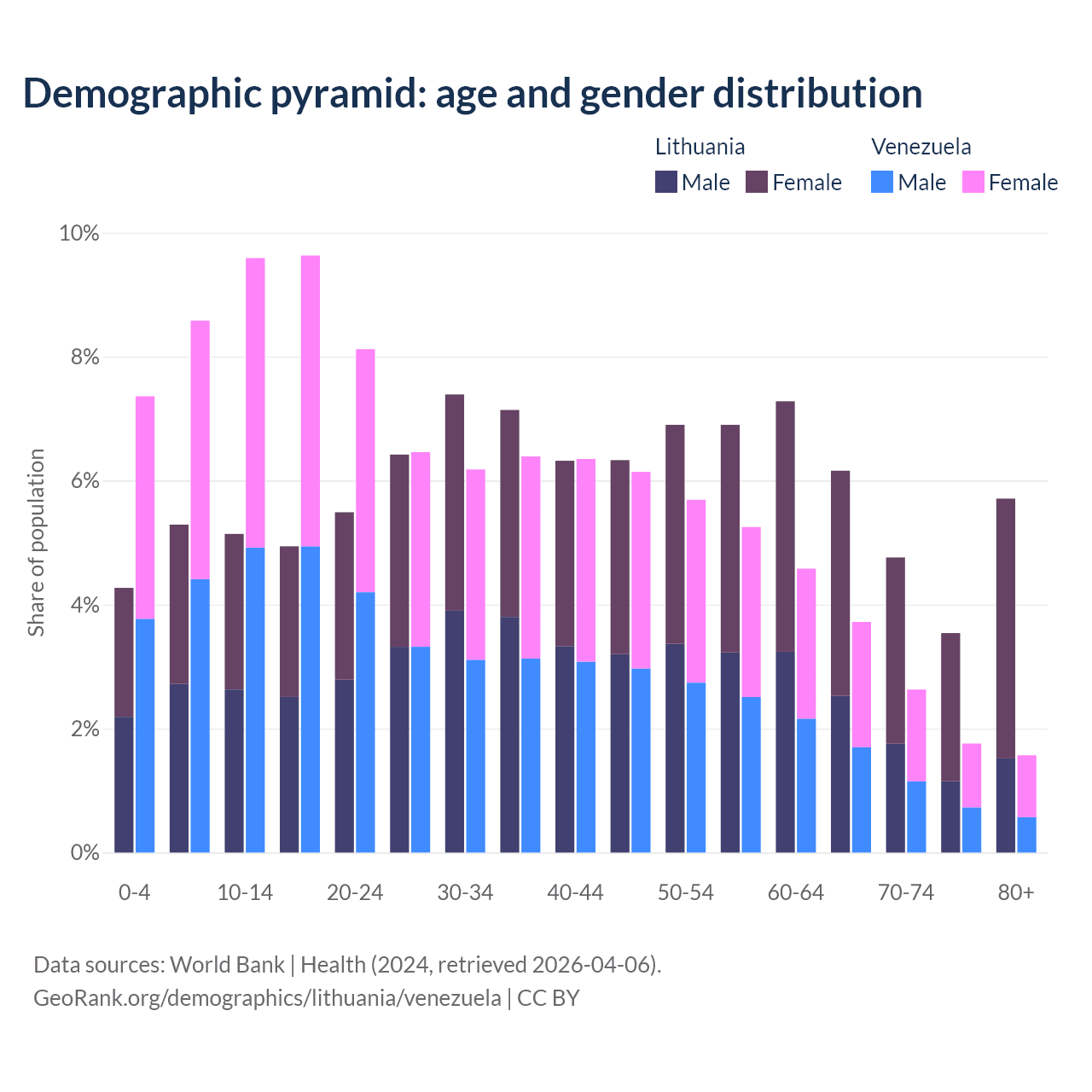 - Lithuania is ranked 28/196 by median age (oldest to youngest) vs 104/196 for Venezuela.
