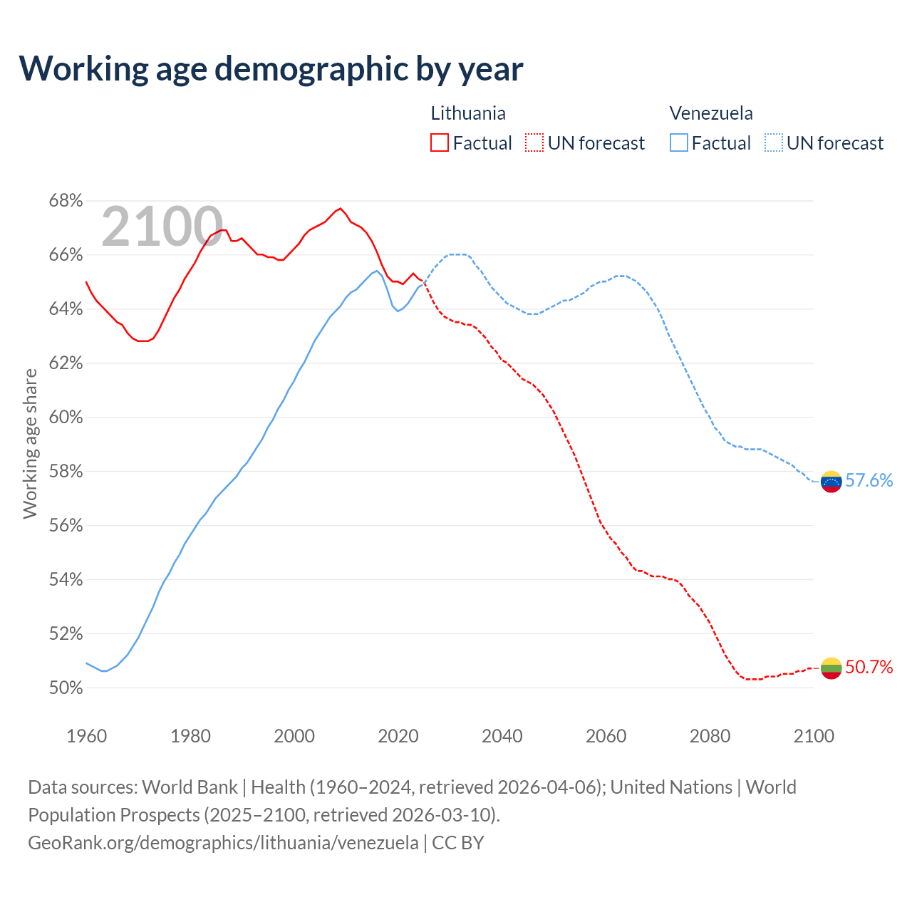 - Lithuania has 1.84M working age adults (aged 15-64) vs 18.6M in Venezuela.