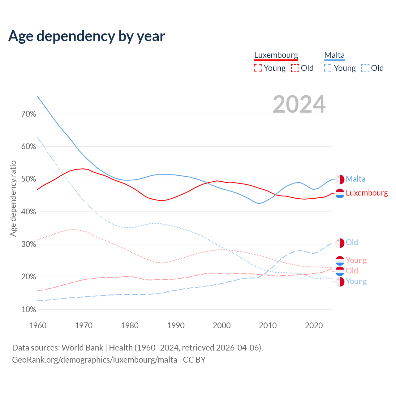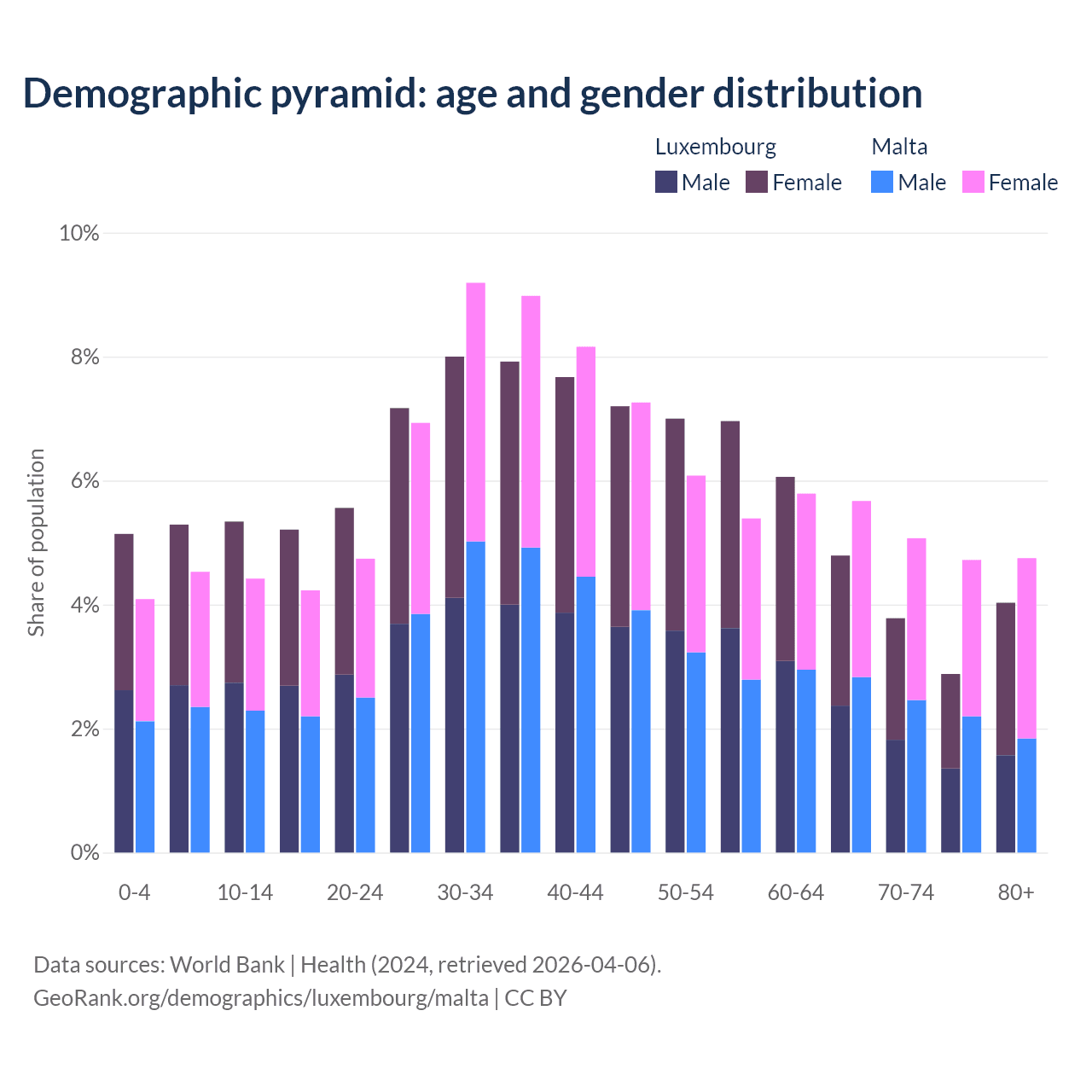 - Luxembourg is ranked 46/196 by median age (oldest to youngest) vs 36/196 for Malta.