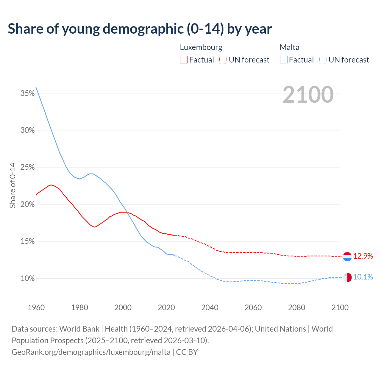 - The share of young demographic (0-15 years old) in Luxembourg is 15.8% vs 13% in Malta.