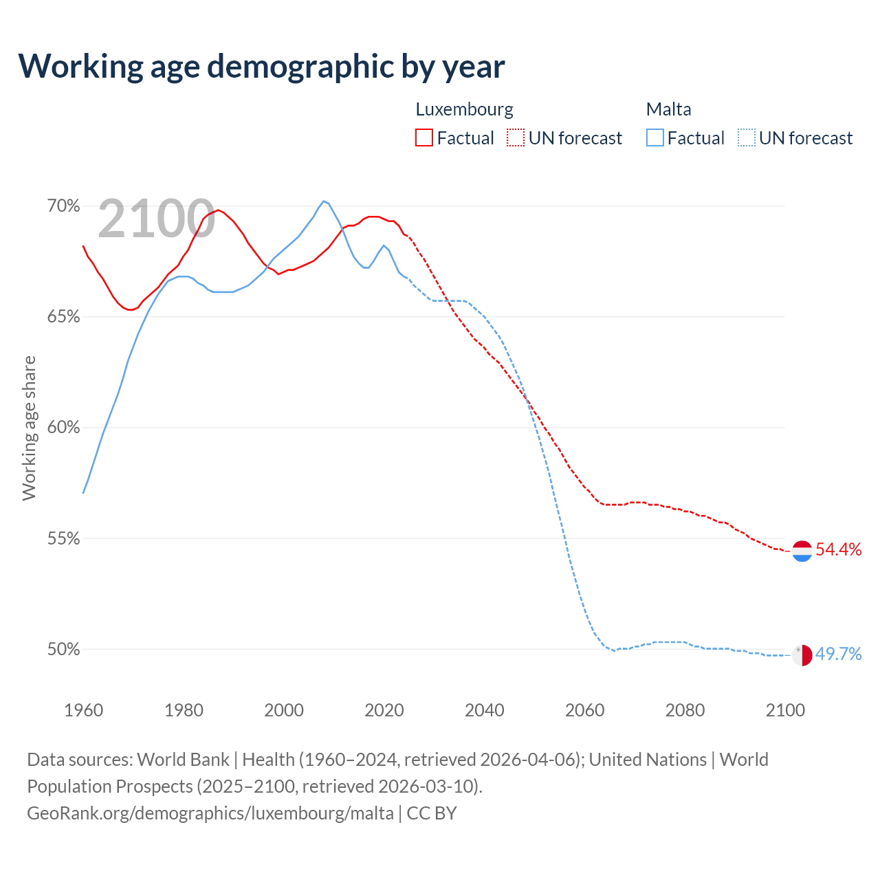 - Luxembourg has 477K working age adults (aged 15-64) vs 388K in Malta.