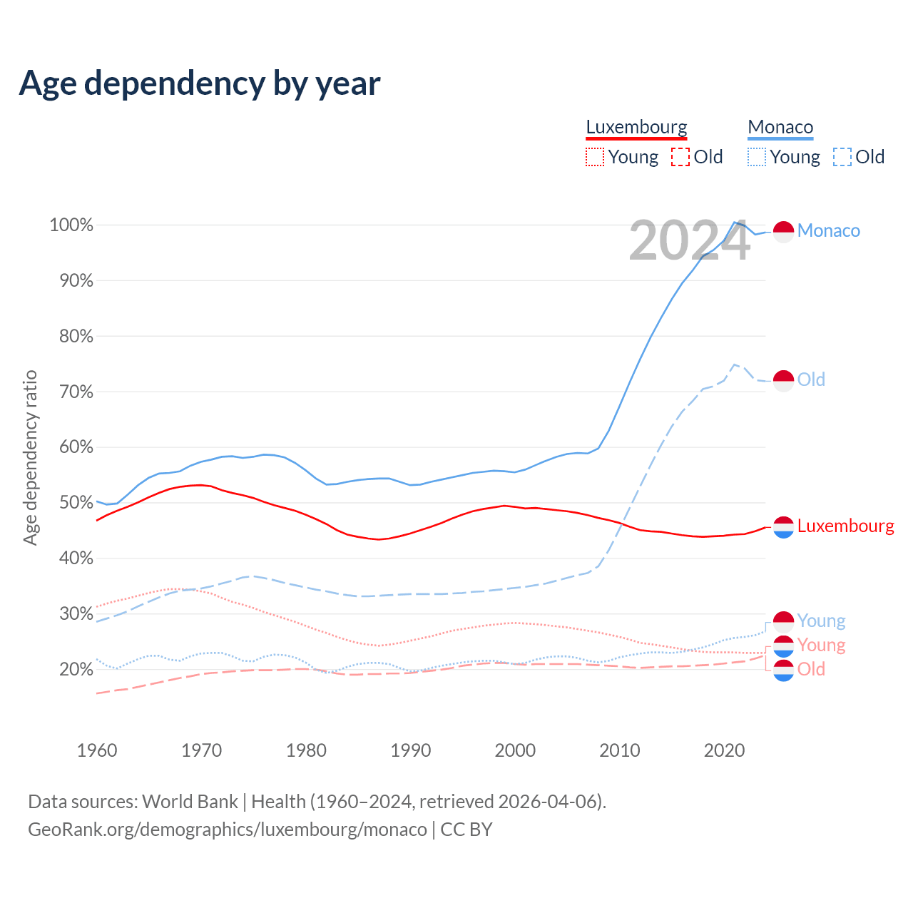 - Luxembourg is ranked 46/196 by median age (oldest to youngest) vs 1/196 for Monaco.