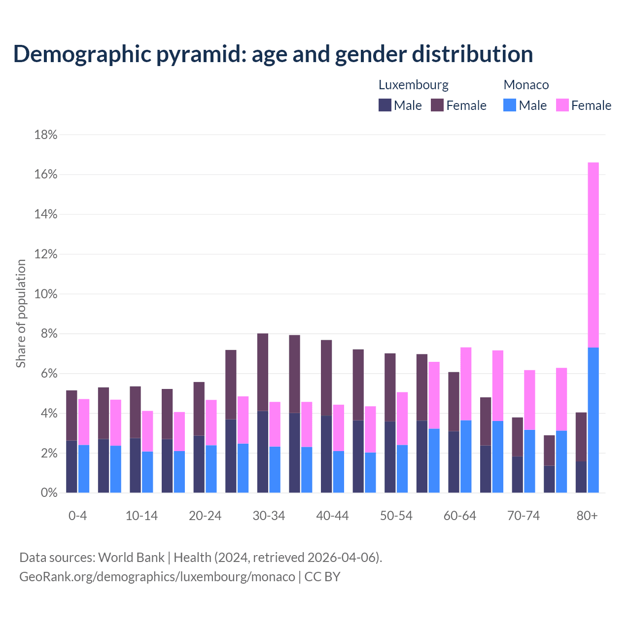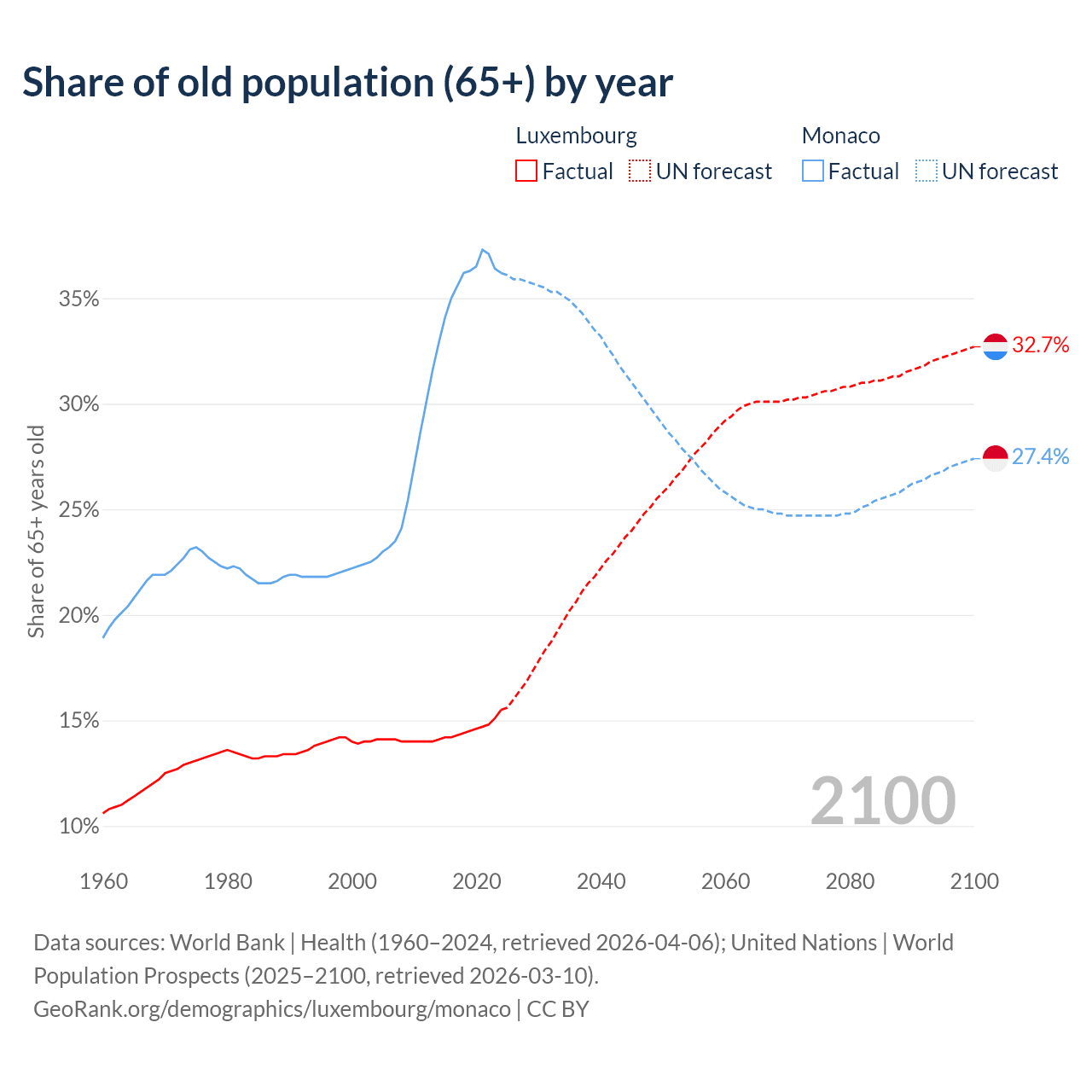 The share of older people aged 65 and over is 15.5% in Luxembourg and 36.2% in Monaco. Life expectancy in Luxembourg compared to Monaco .