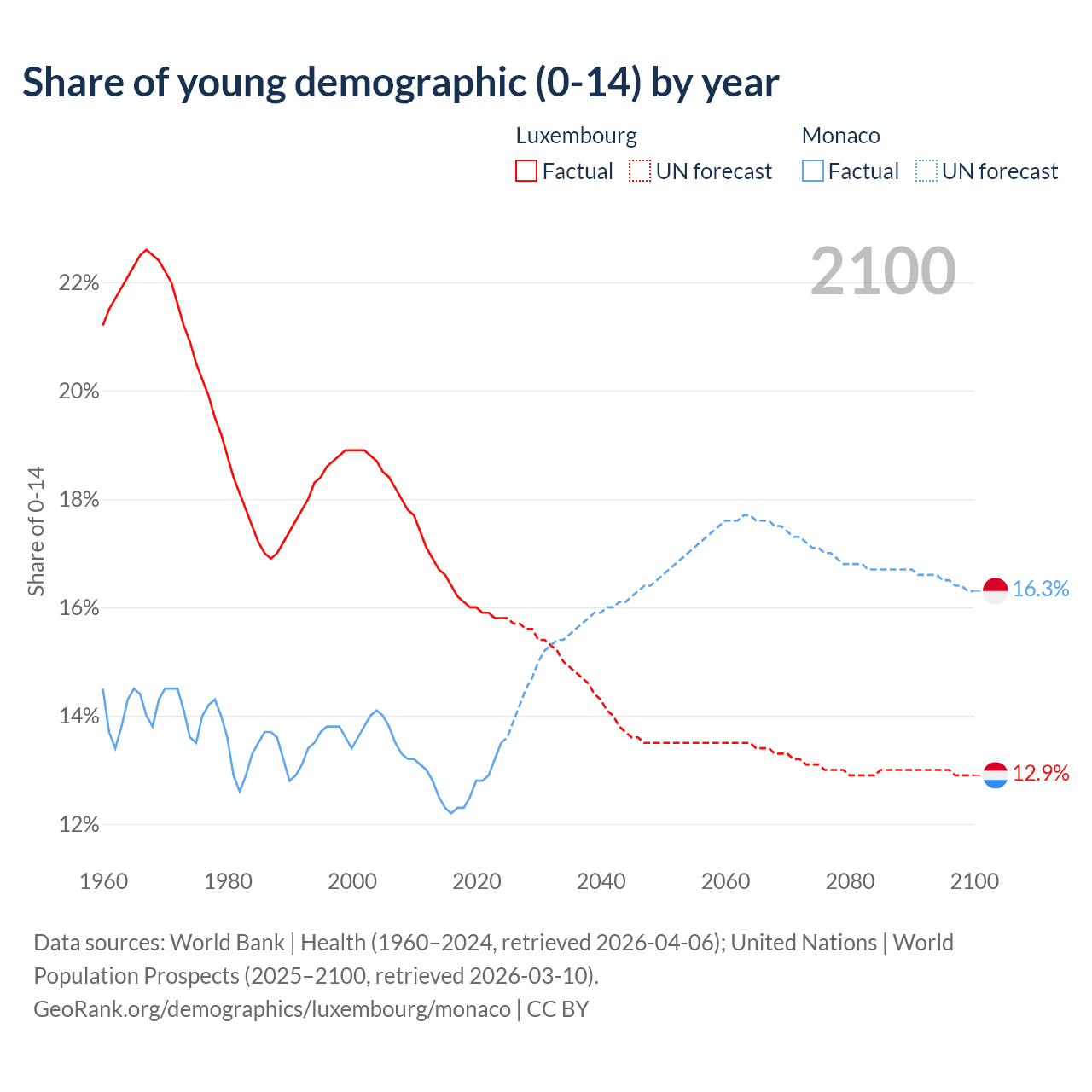 - The share of young demographic (0-15 years old) in Luxembourg is 15.8% vs 13.5% in Monaco.