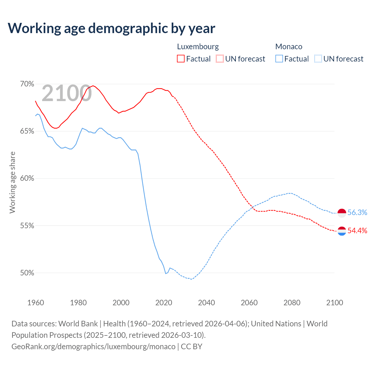 Median age Luxembourg vs Monaco, 1960-2100