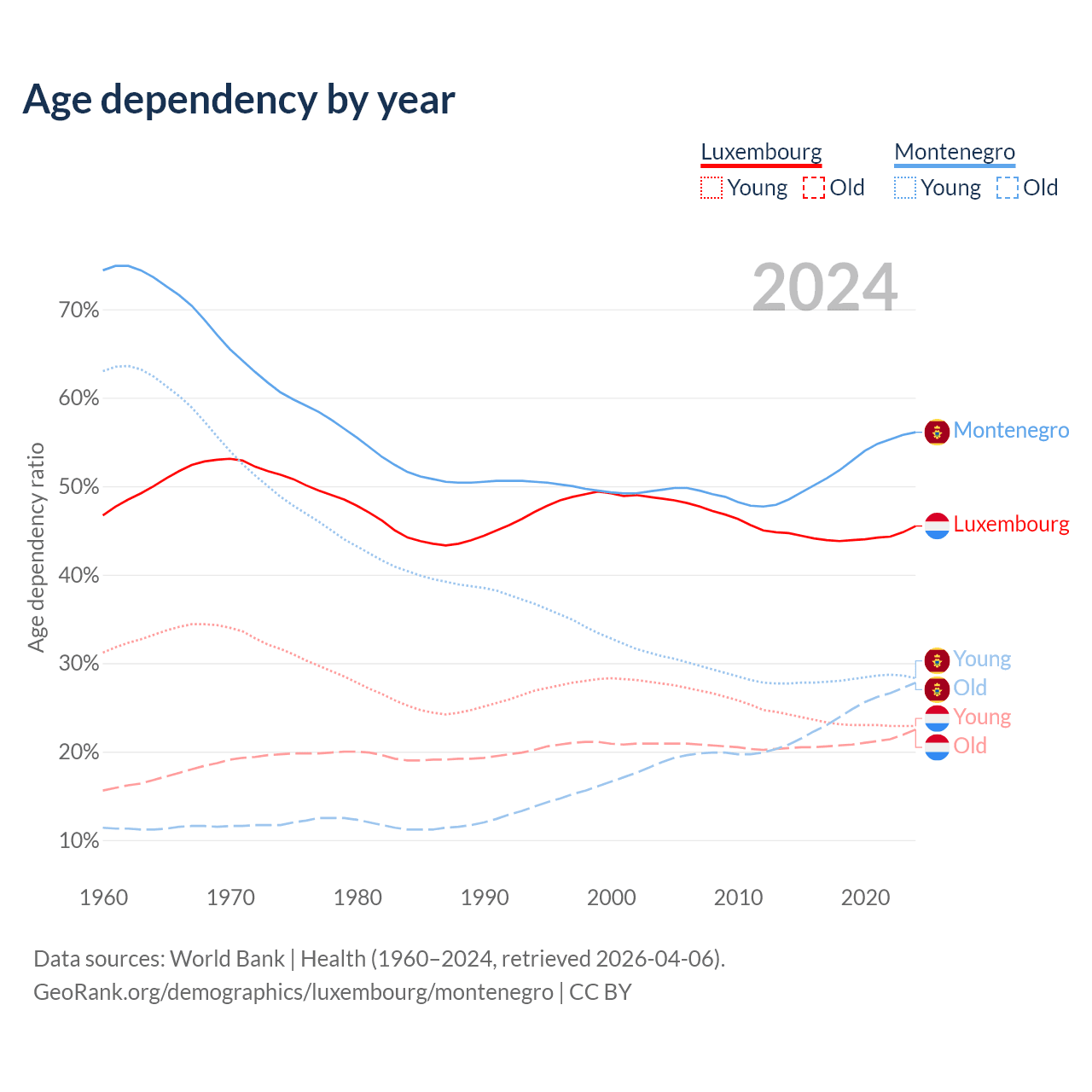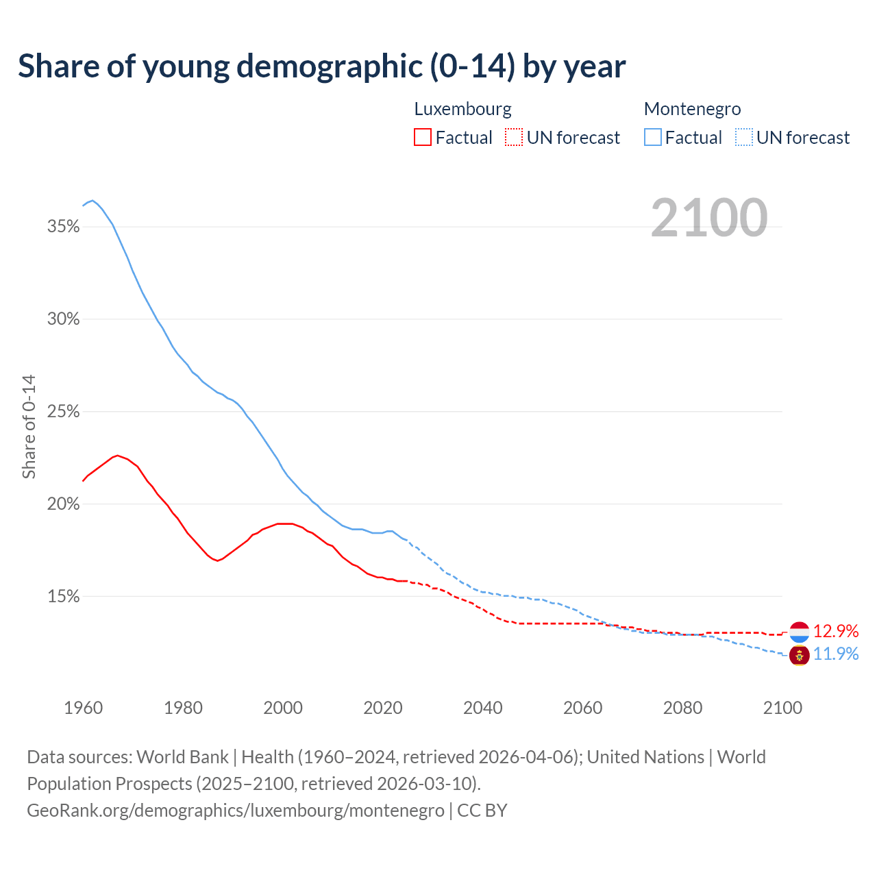 - The share of young demographic (0-15 years old) in Luxembourg is 15.8% vs 18.1% in Montenegro.