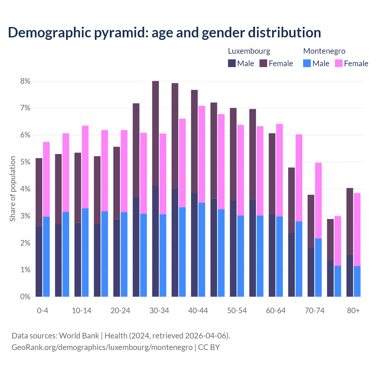 - Luxembourg is ranked 46/196 by median age (oldest to youngest) vs 45/196 for Montenegro.