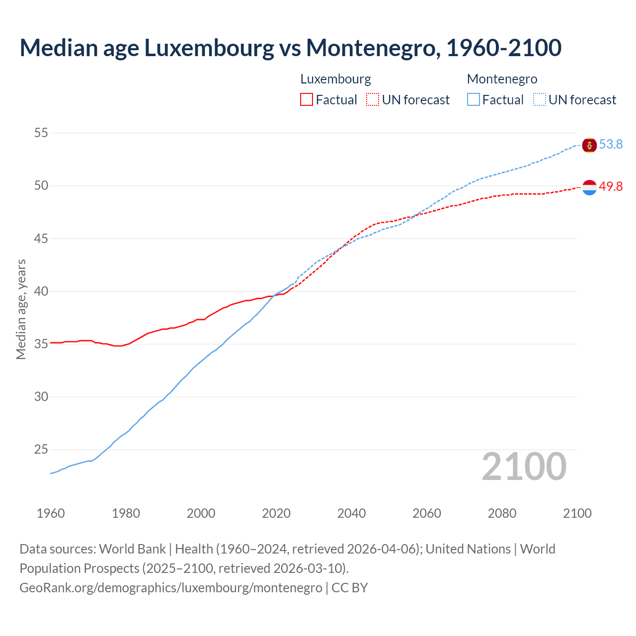 - The median age in Luxembourg is 40.2 years compared to 40.6 years in Montenegro.