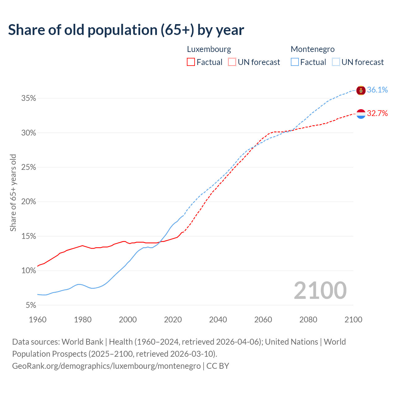 - The share of old-age demographic (65+) in Luxembourg is 15.5% vs 17.8% in Montenegro.