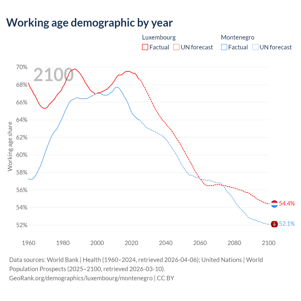 - Luxembourg has 477K working age adults (aged 15-64) vs 392K in Montenegro.