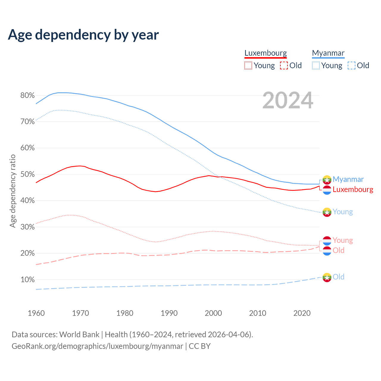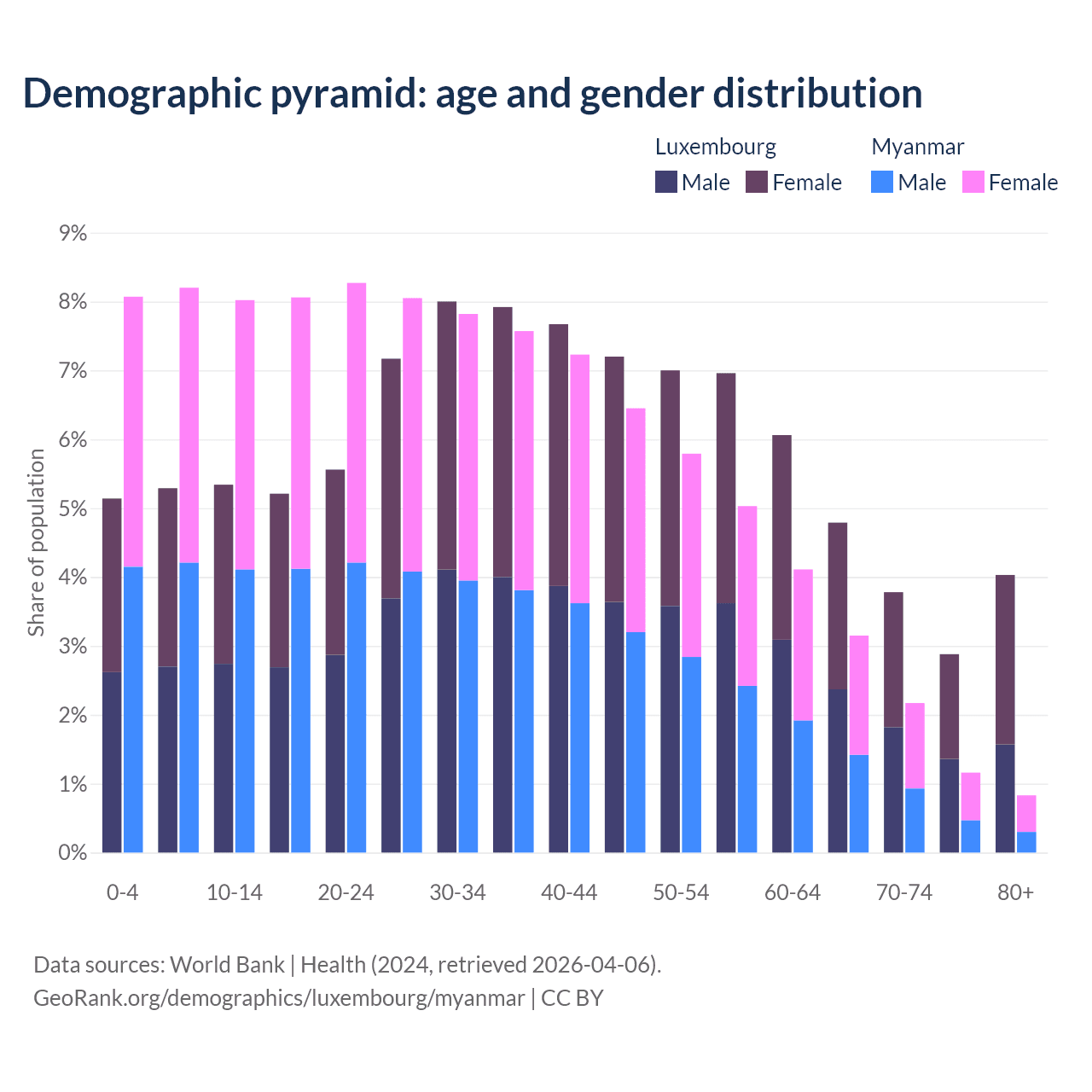 - The share of young demographic (0-15 years old) in Luxembourg is 15.8% vs 24.3% in Myanmar.