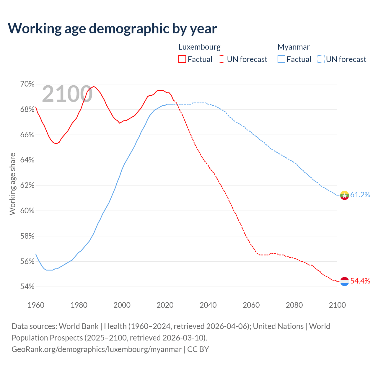Median age Luxembourg vs Myanmar, 1960-2100