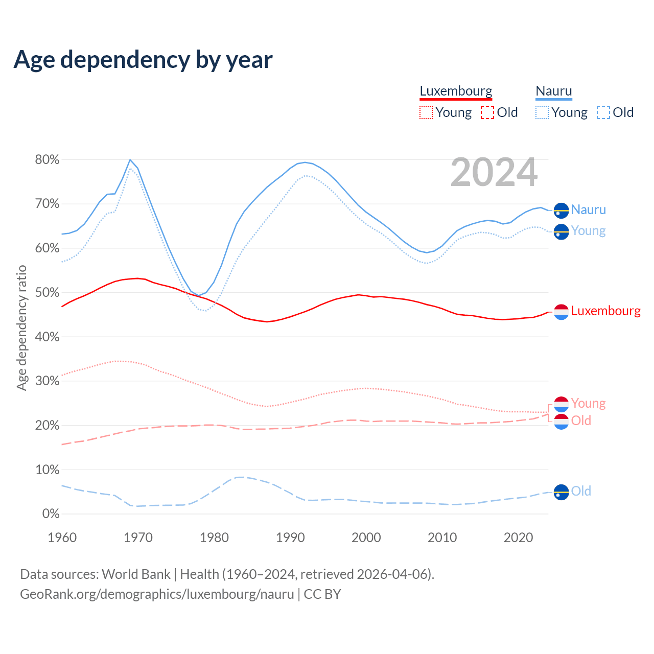 - Luxembourg is ranked 46/196 by median age (oldest to youngest) vs 155/196 for Nauru.