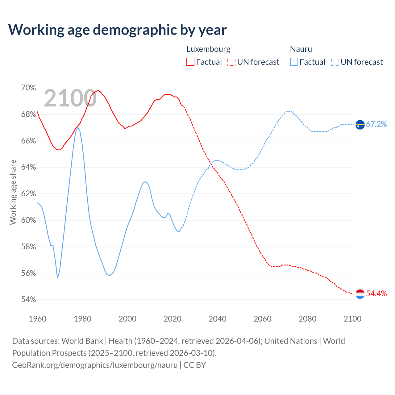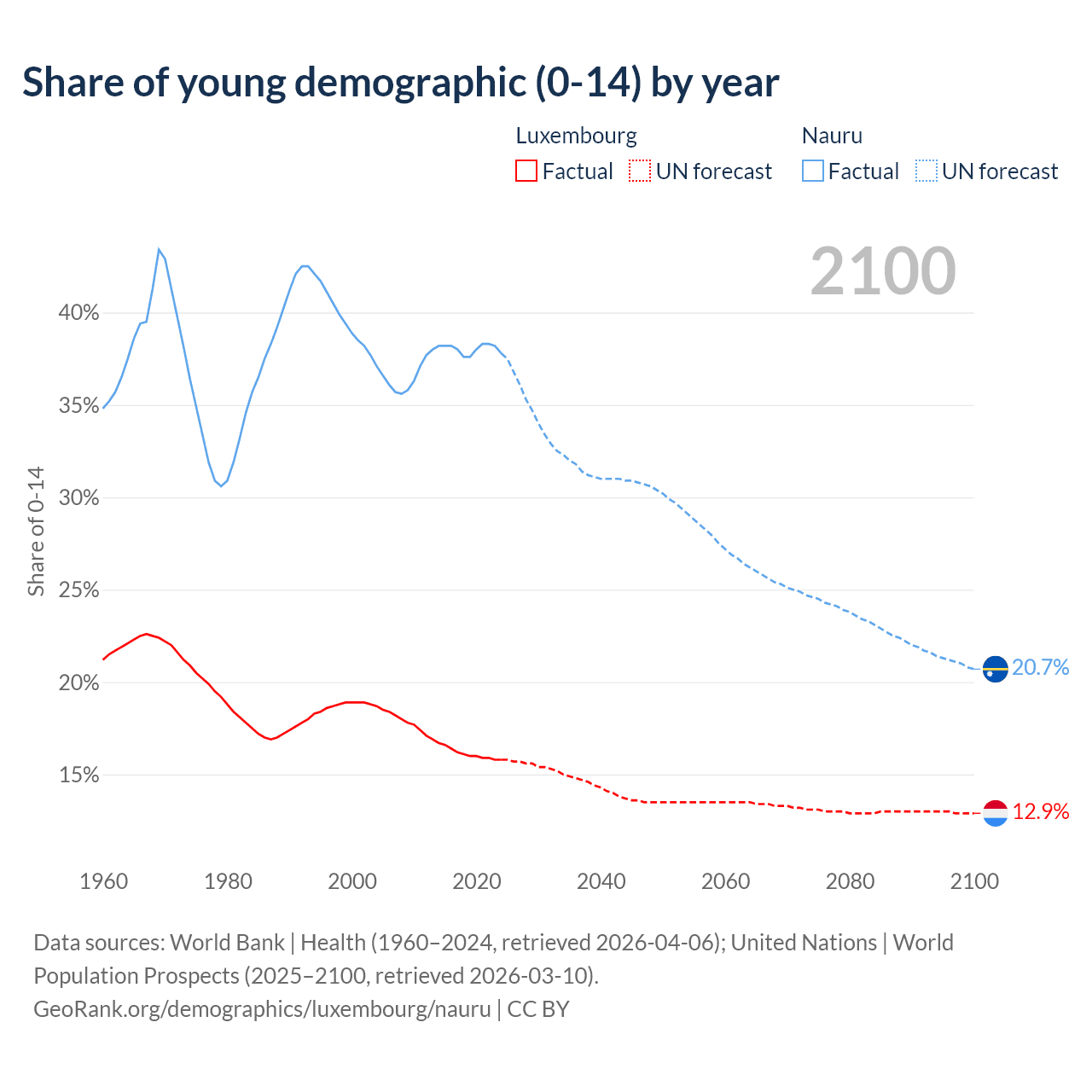 Median age Luxembourg vs Nauru, 1960-2100