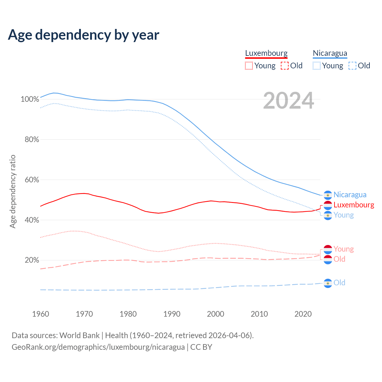 The share of older people aged 65 and over is 15.5% in Luxembourg and 5.53% in Nicaragua. Life expectancy in Luxembourg compared to Nicaragua .