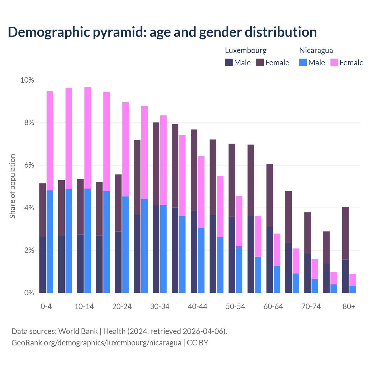 - Luxembourg is ranked 46/196 by median age (oldest to youngest) vs 125/196 for Nicaragua.