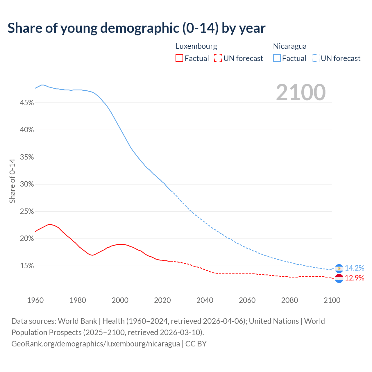 - The share of young demographic (0-15 years old) in Luxembourg is 15.8% vs 28.8% in Nicaragua.