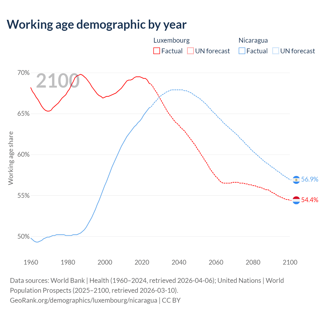 - Luxembourg has 477K working age adults (aged 15-64) vs 4.68M in Nicaragua.