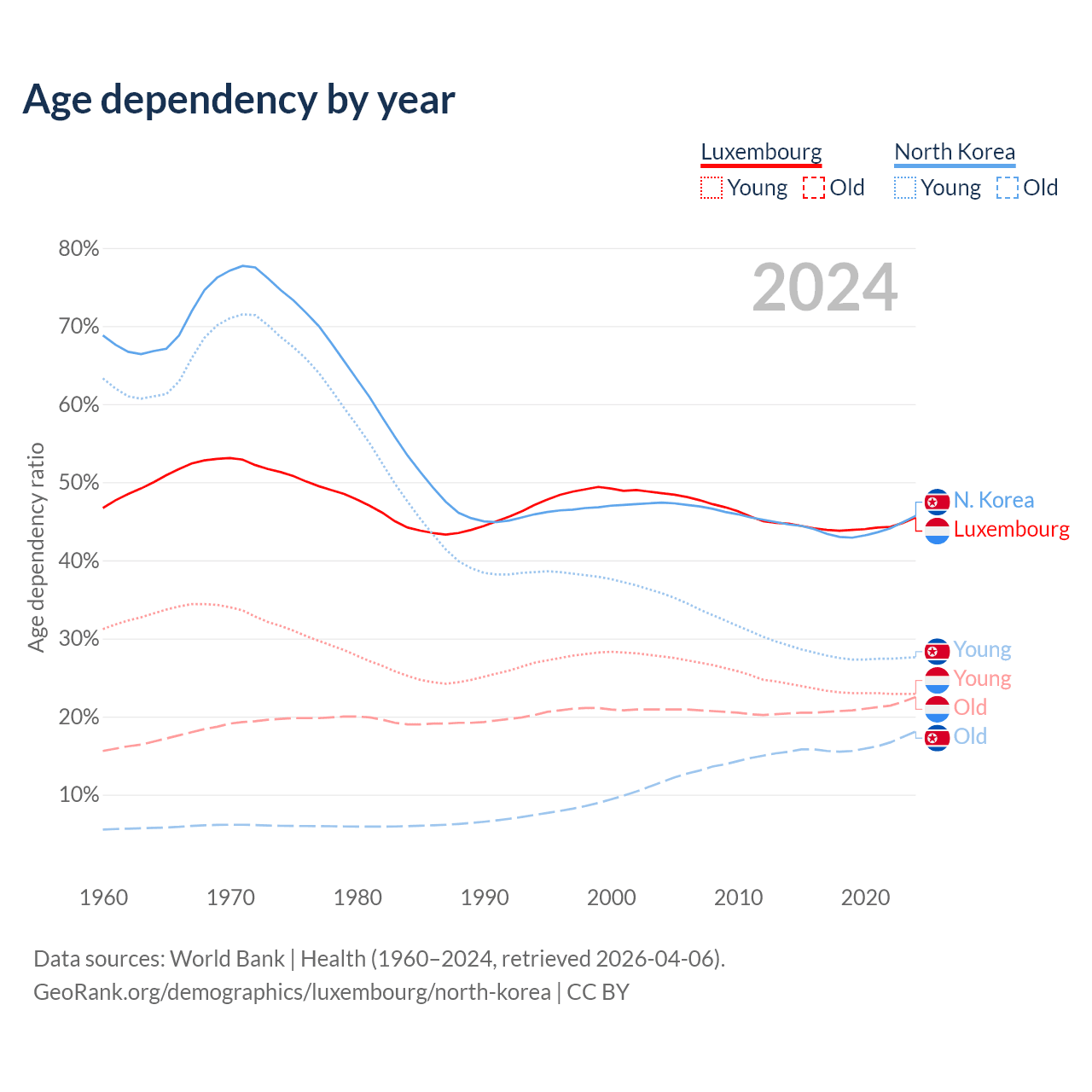 - The share of old-age demographic (65+) in Luxembourg is 15.5% vs 12.4% in North Korea.