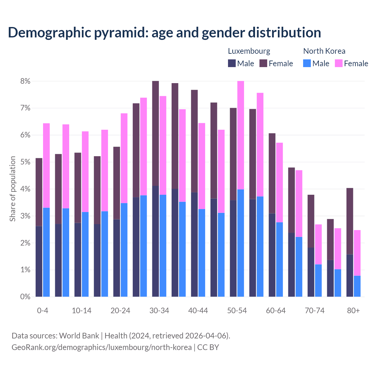 - Luxembourg is ranked 46/196 by median age (oldest to youngest) vs 62/196 for North Korea.