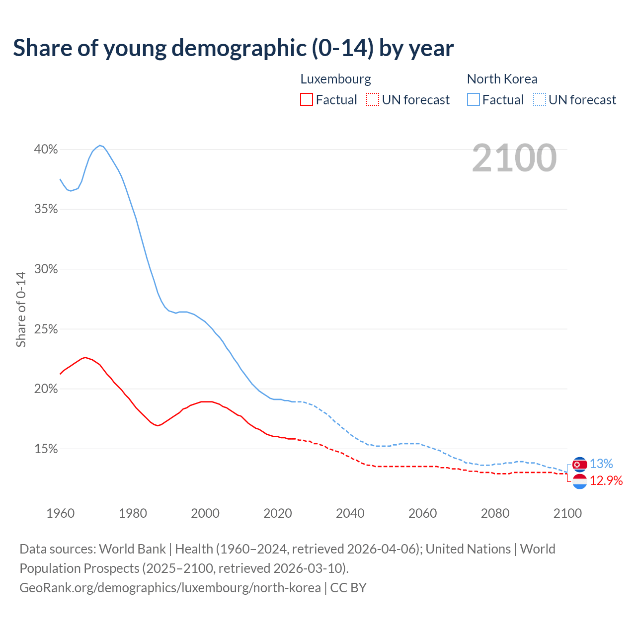 - The share of young demographic (0-15 years old) in Luxembourg is 15.8% vs 18.9% in North Korea.