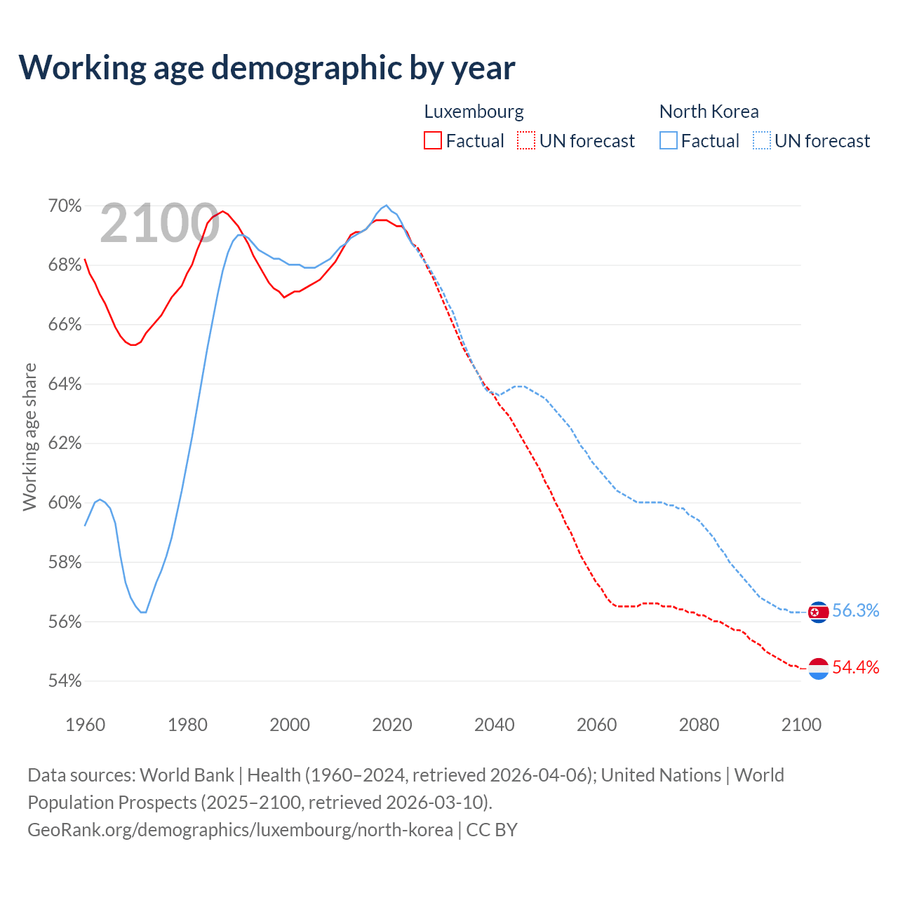 - Luxembourg has 477K working age adults (aged 15-64) vs 18.3M in North Korea.