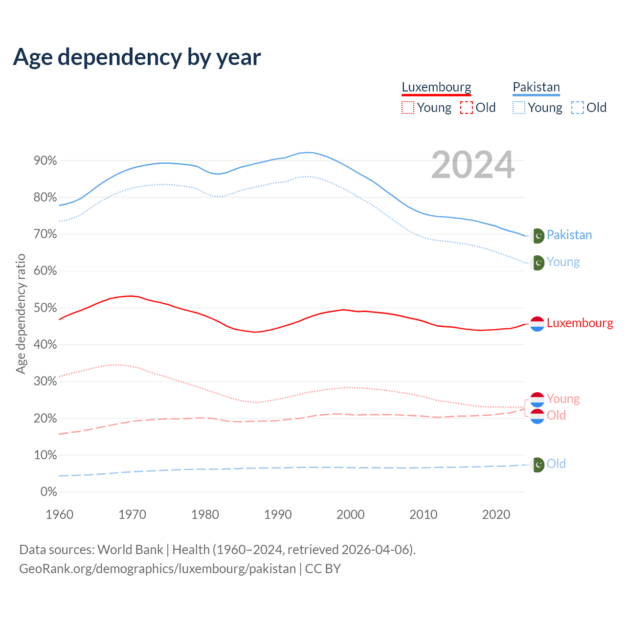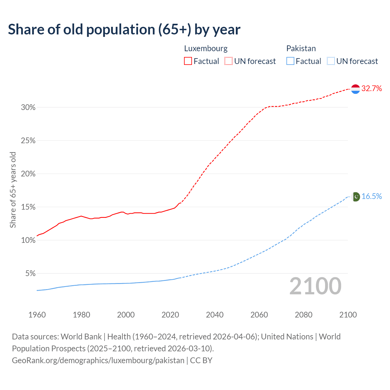 - The share of old-age demographic (65+) in Luxembourg is 15.5% vs 4.28% in Pakistan.