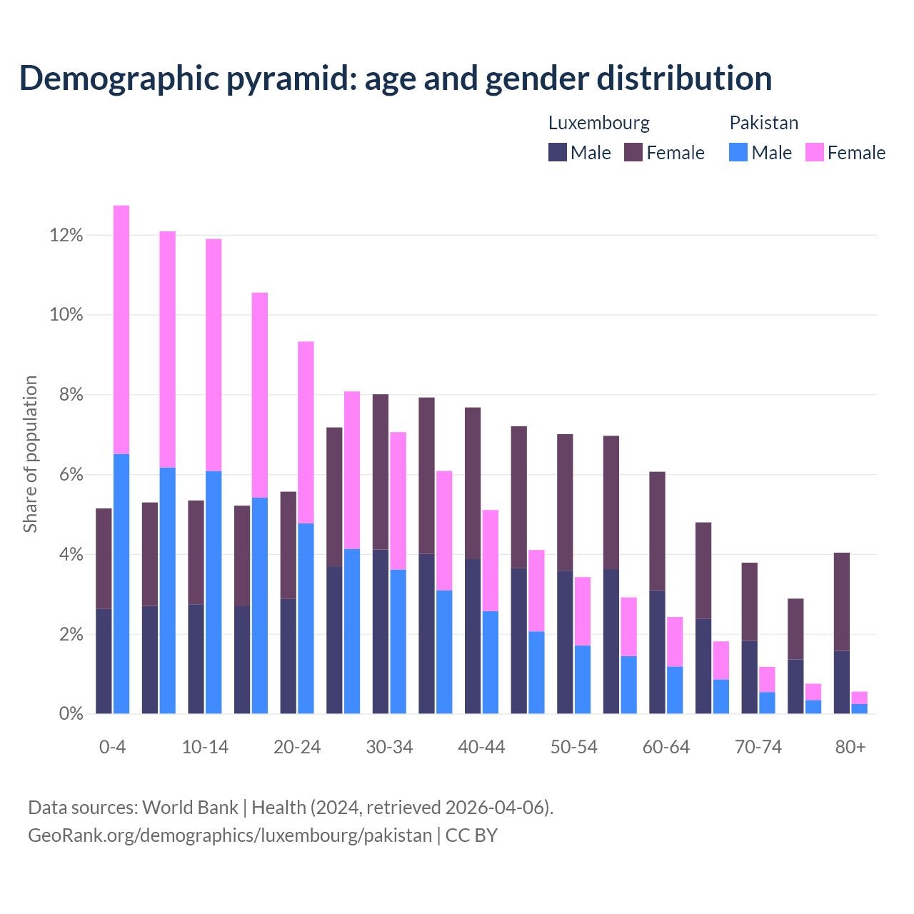 - As of 2026, the population of Luxembourg is 694K vs 260M in Pakistan - 375 times difference.