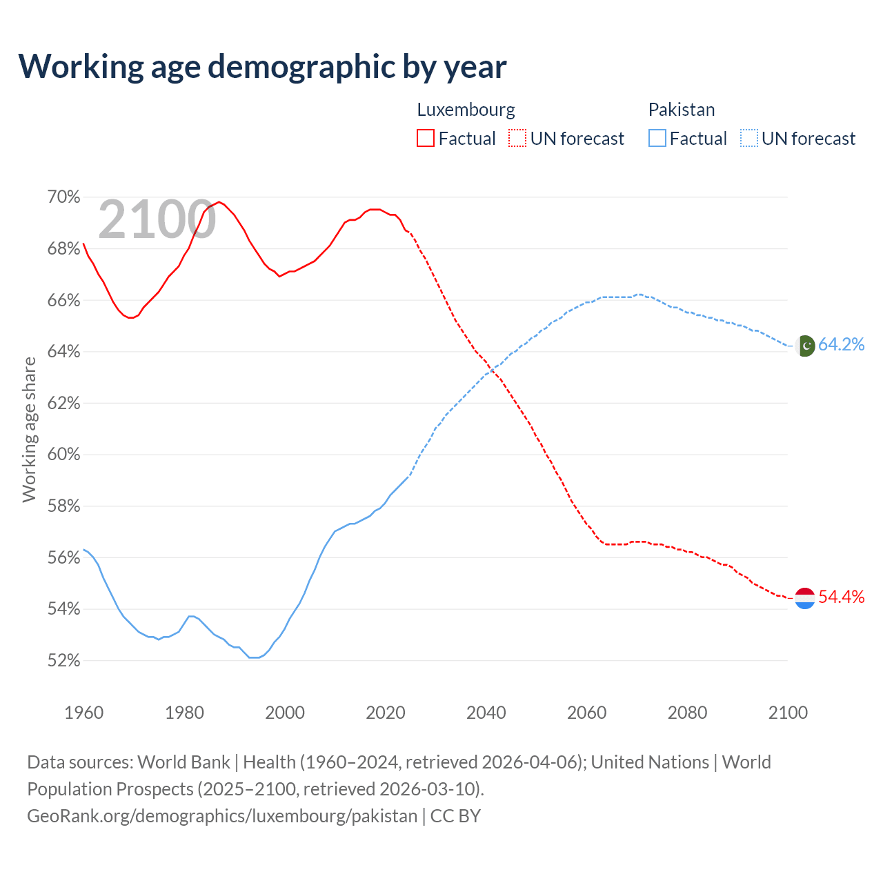 - Luxembourg has 477K working age adults (aged 15-64) vs 154M in Pakistan.