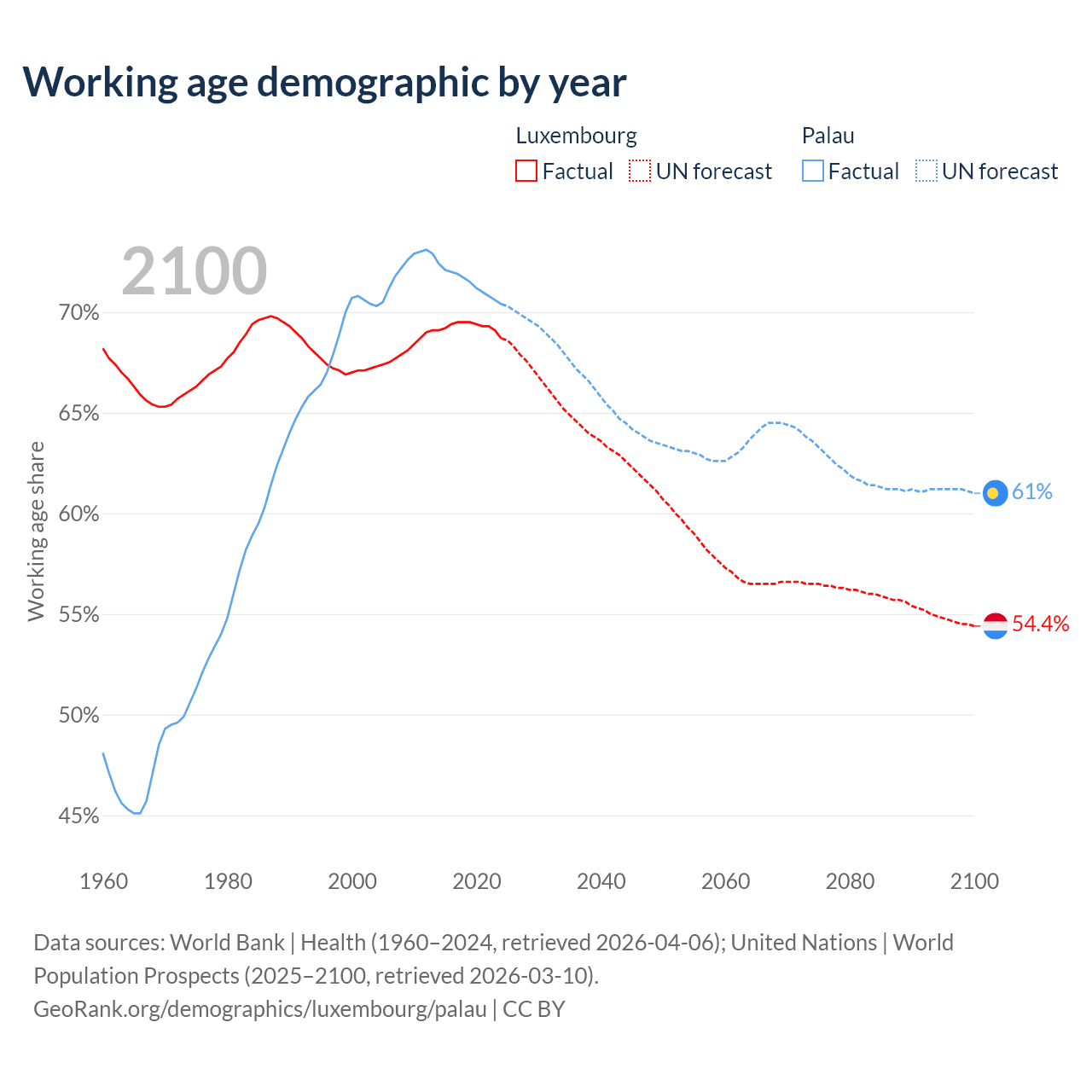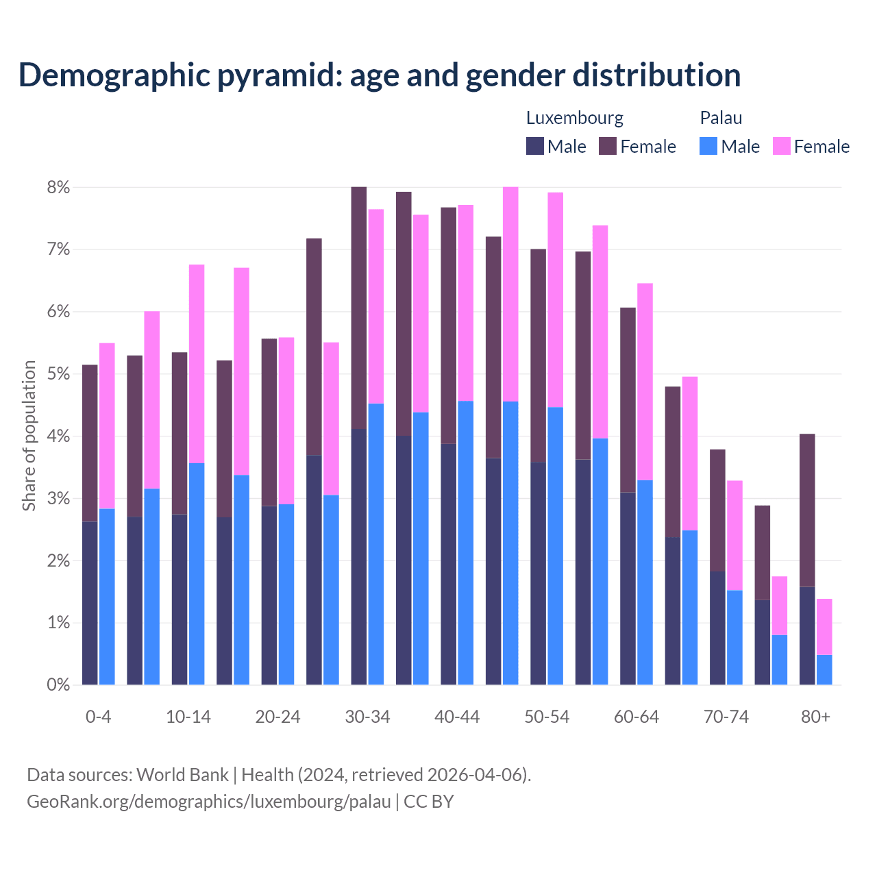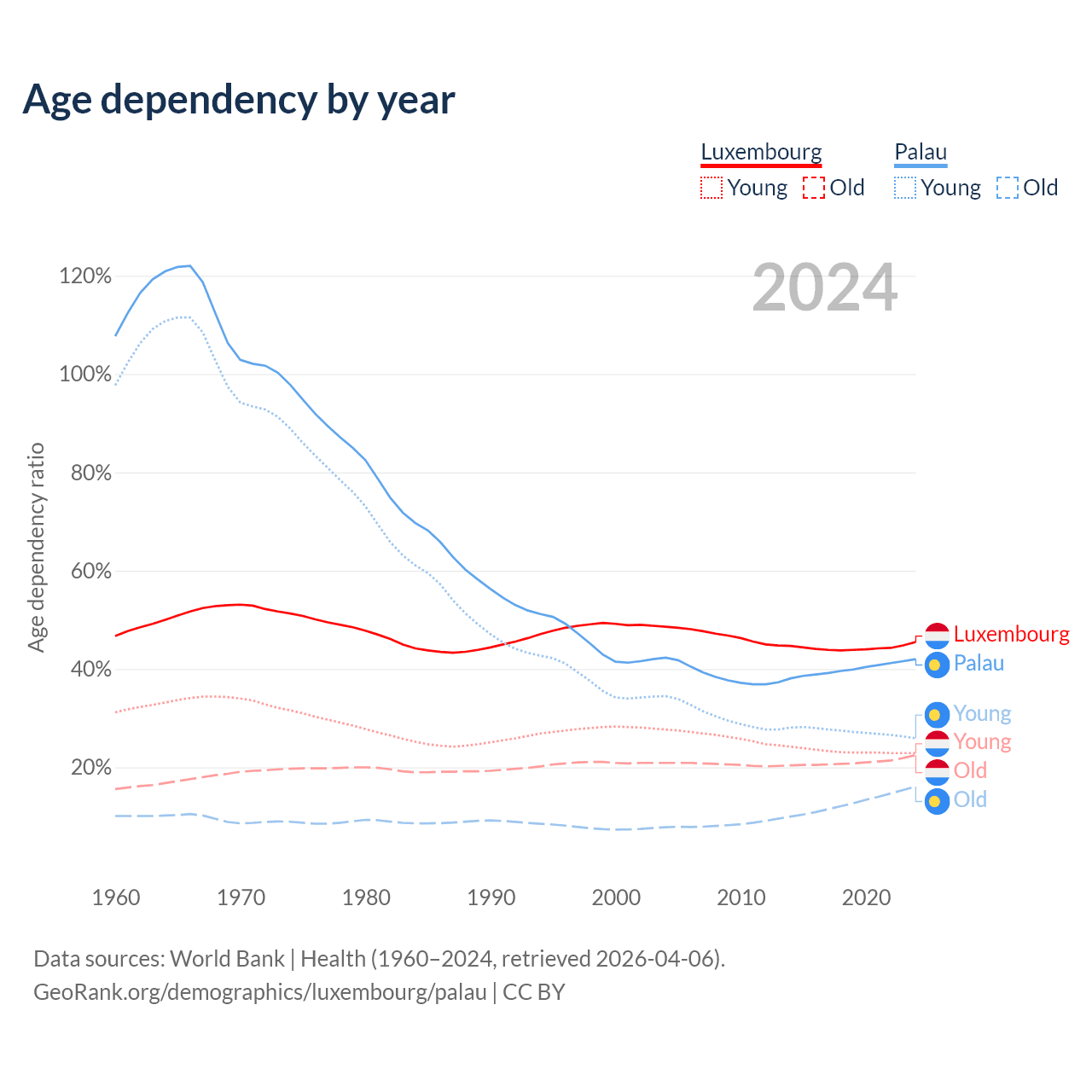 - The share of young demographic (0-15 years old) in Luxembourg is 15.8% vs 18.2% in Palau.