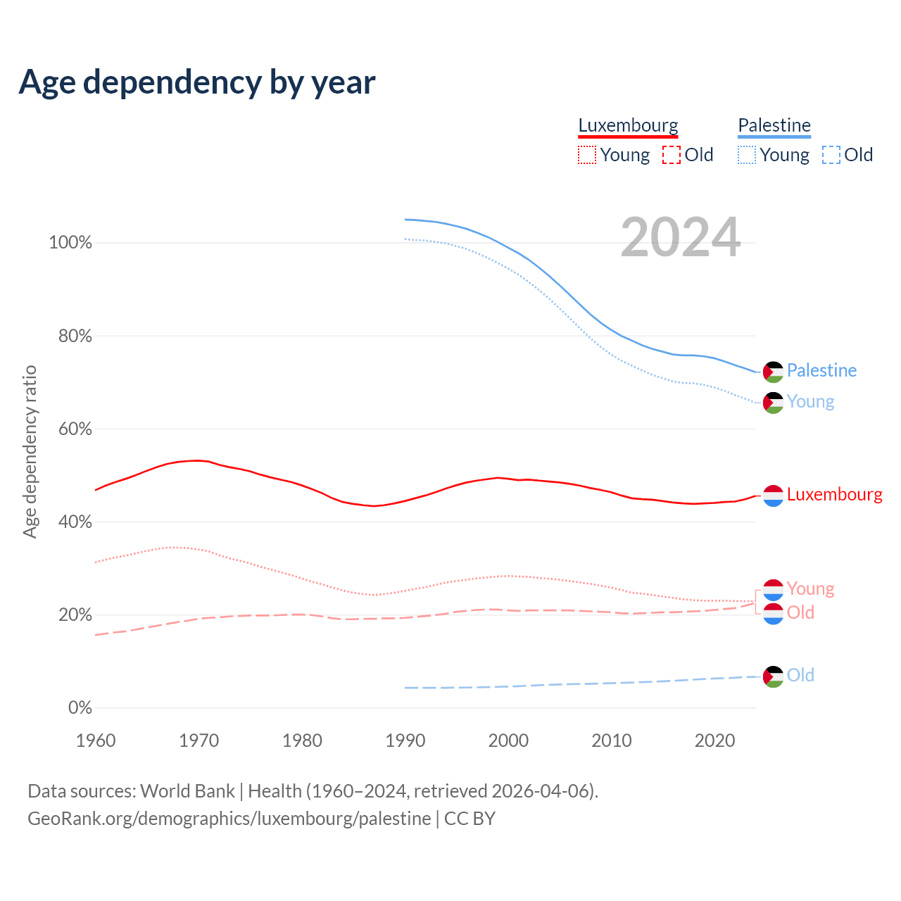 - The share of old-age demographic (65+) in Luxembourg is 15.5% vs 3.84% in Palestine.