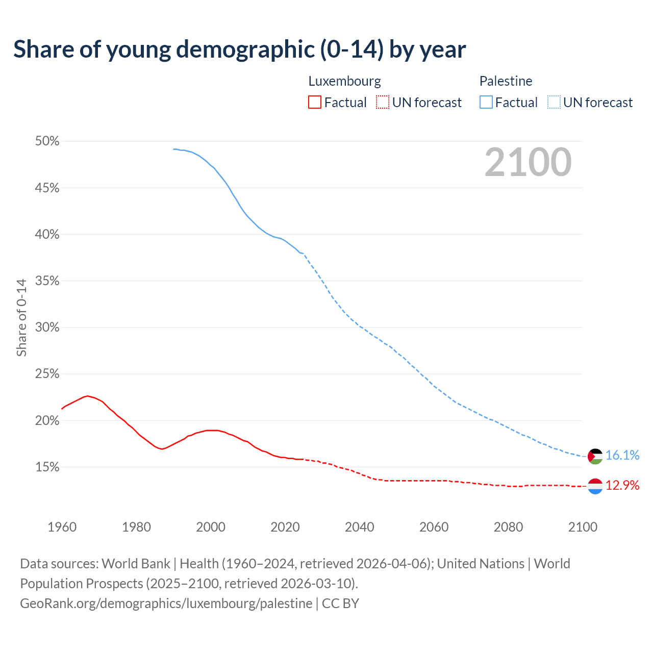 - The share of young demographic (0-15 years old) in Luxembourg is 15.8% vs 38% in Palestine.