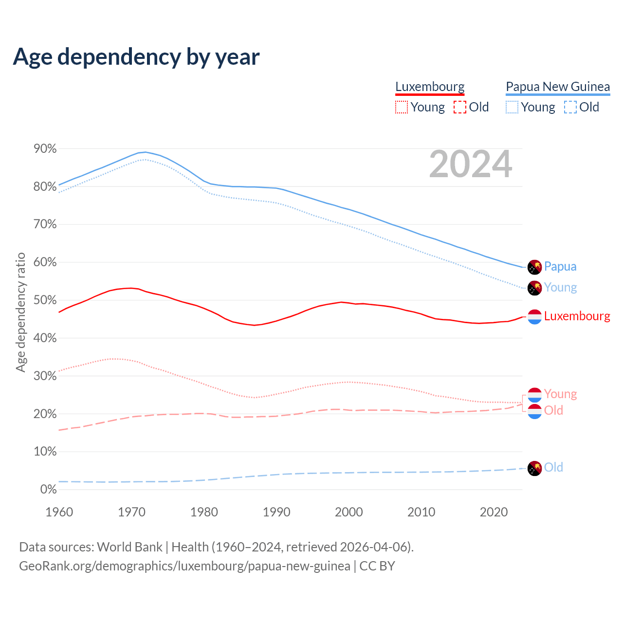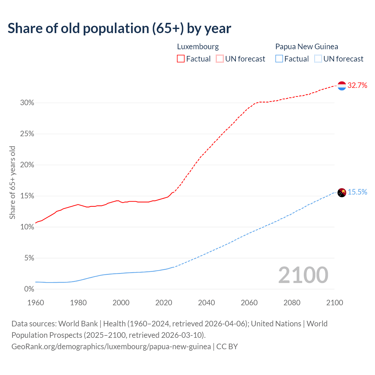 The share of older people aged 65 and over is 15.5% in Luxembourg and 3.46% in Papua New Guinea. Life expectancy in Luxembourg compared to Papua New Guinea .
