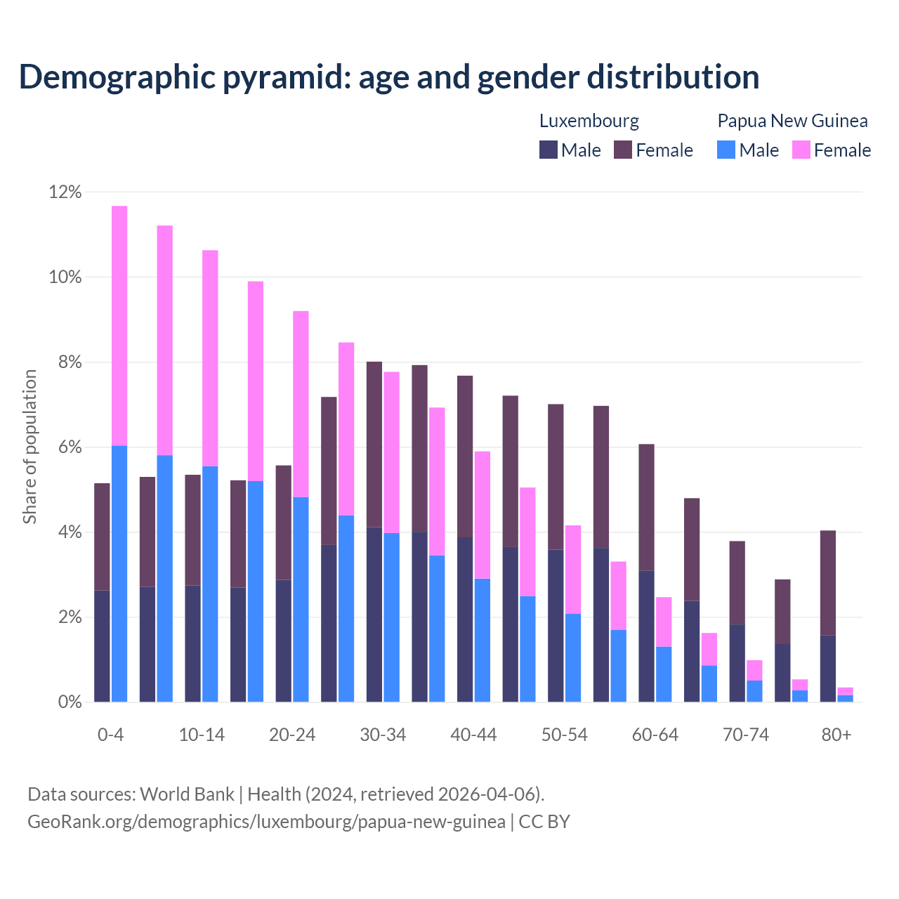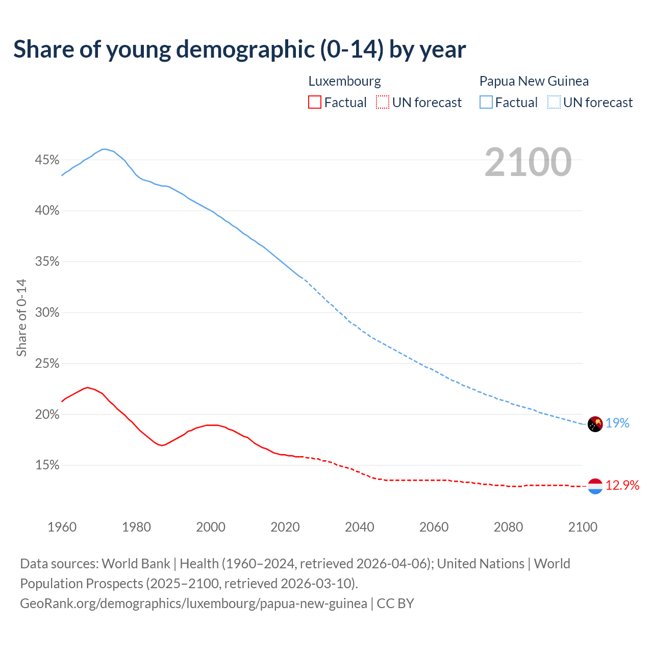 - The share of young demographic (0-15 years old) in Luxembourg is 15.8% vs 33.5% in Papua New Guinea.