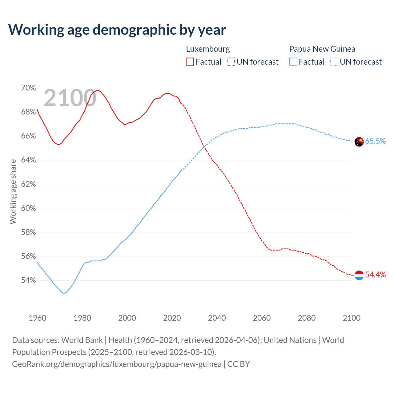 Median age Luxembourg vs Papua New Guinea, 1960-2100