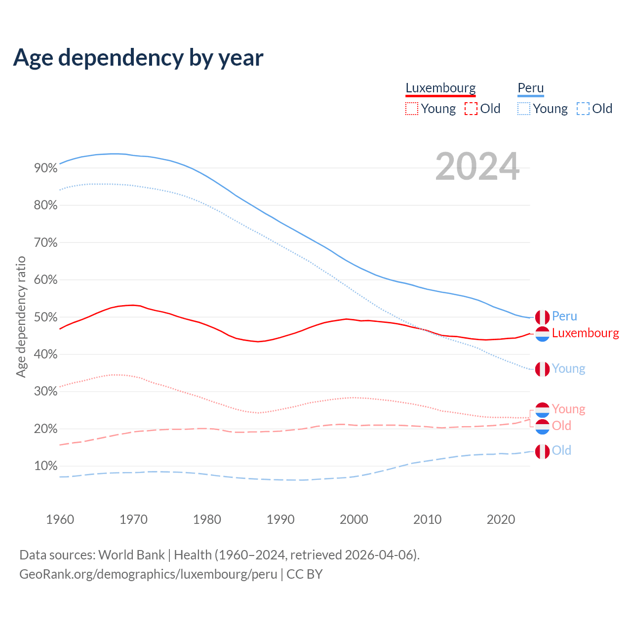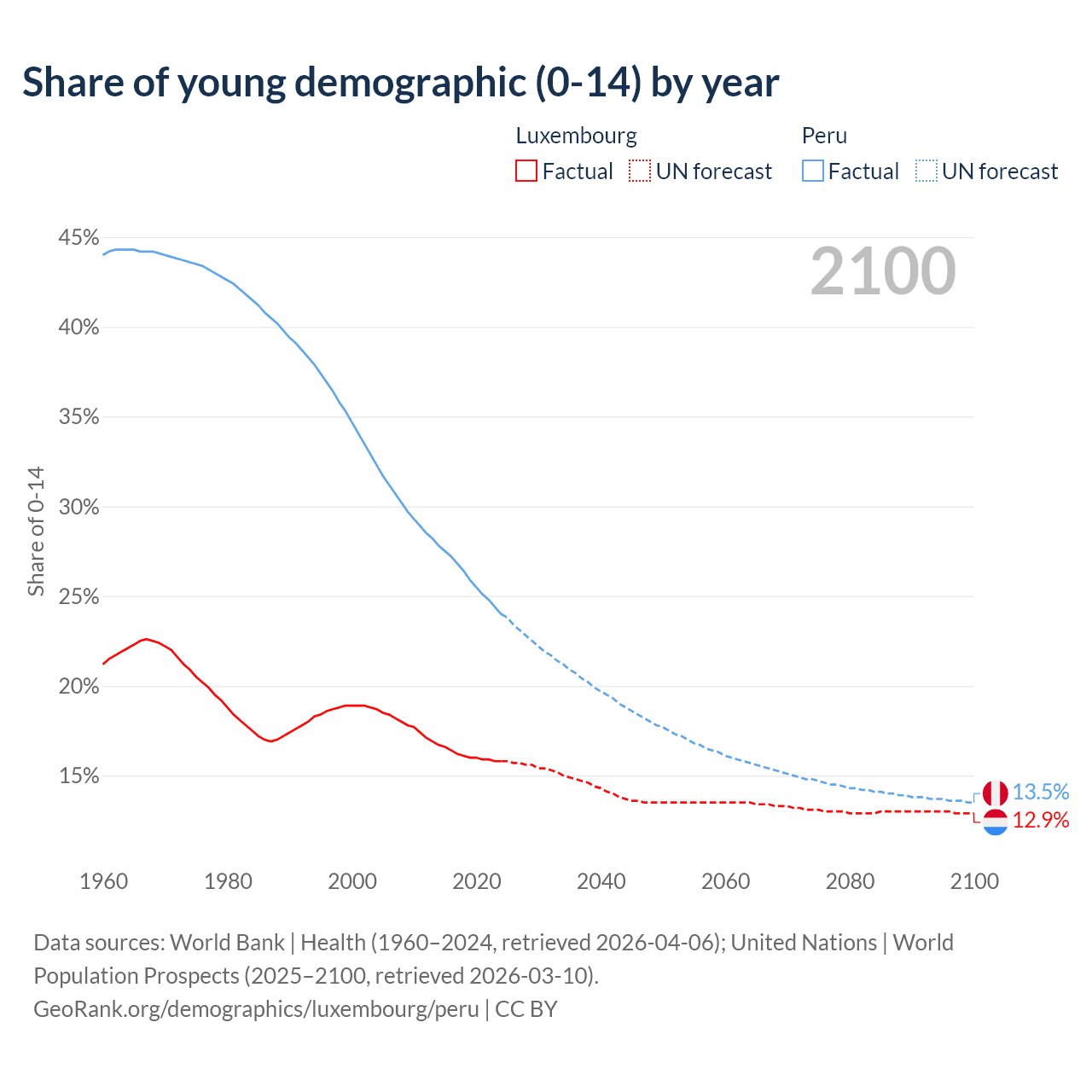 - The share of young demographic (0-15 years old) in Luxembourg is 15.8% vs 24% in Peru.