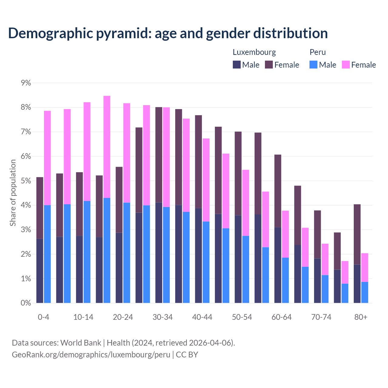 - Luxembourg is ranked 46/196 by median age (oldest to youngest) vs 97/196 for Peru.