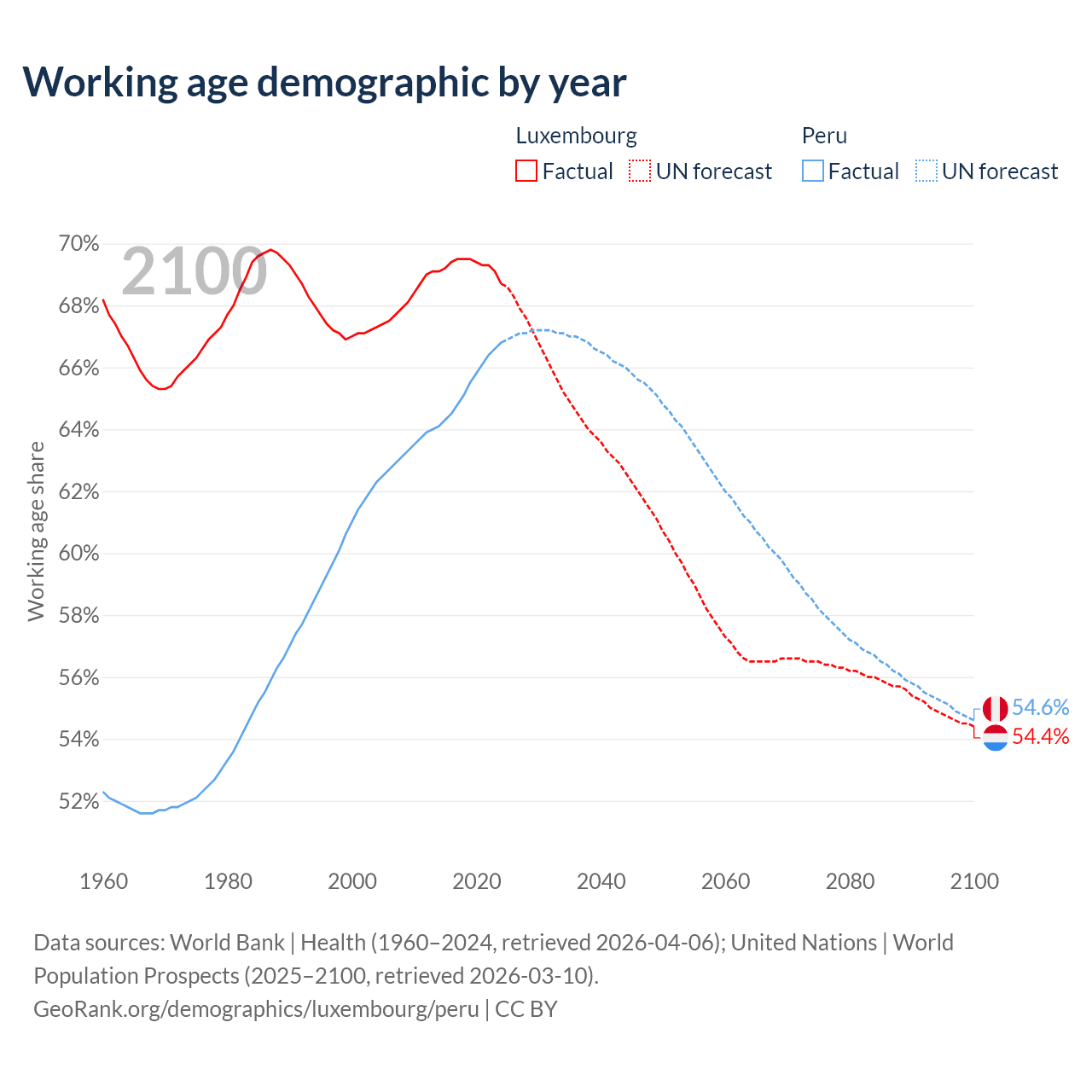 - Luxembourg has 477K working age adults (aged 15-64) vs 23.4M in Peru.