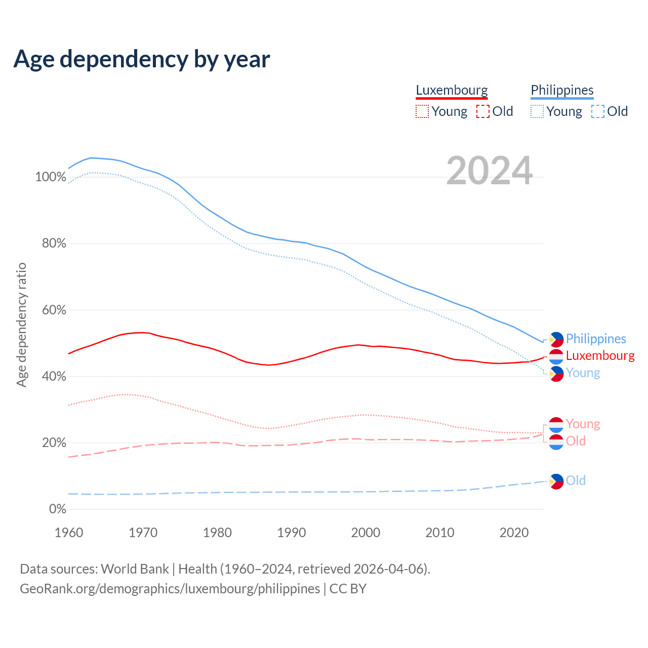 - Luxembourg is ranked 46/196 by median age (oldest to youngest) vs 123/196 for the Philippines.