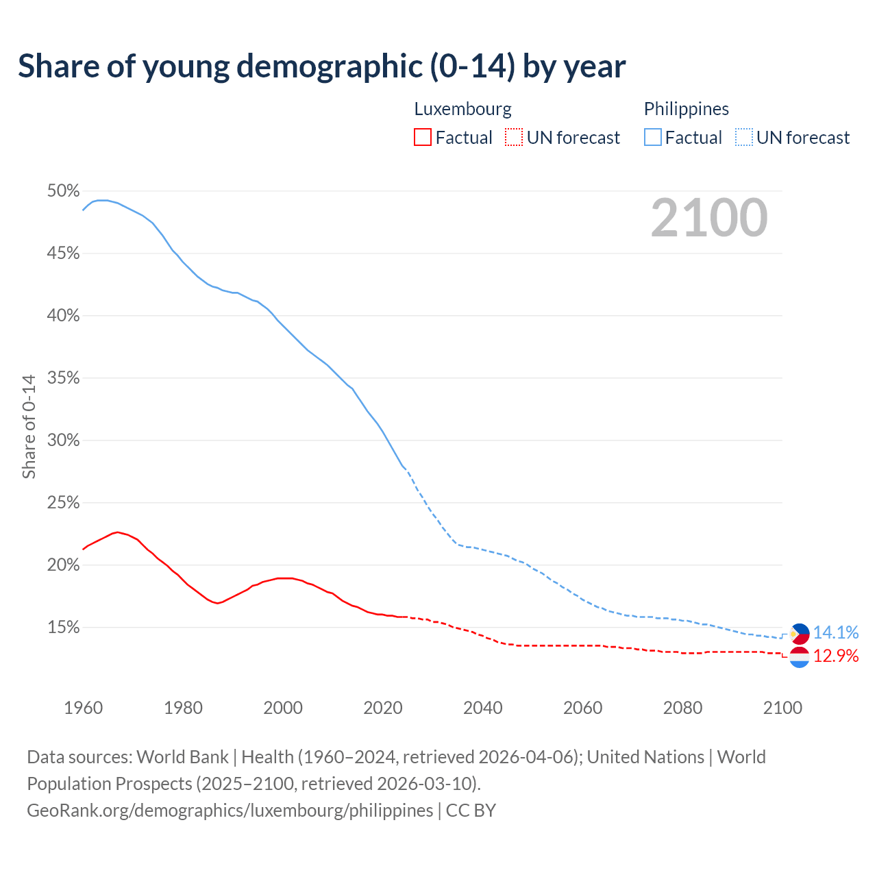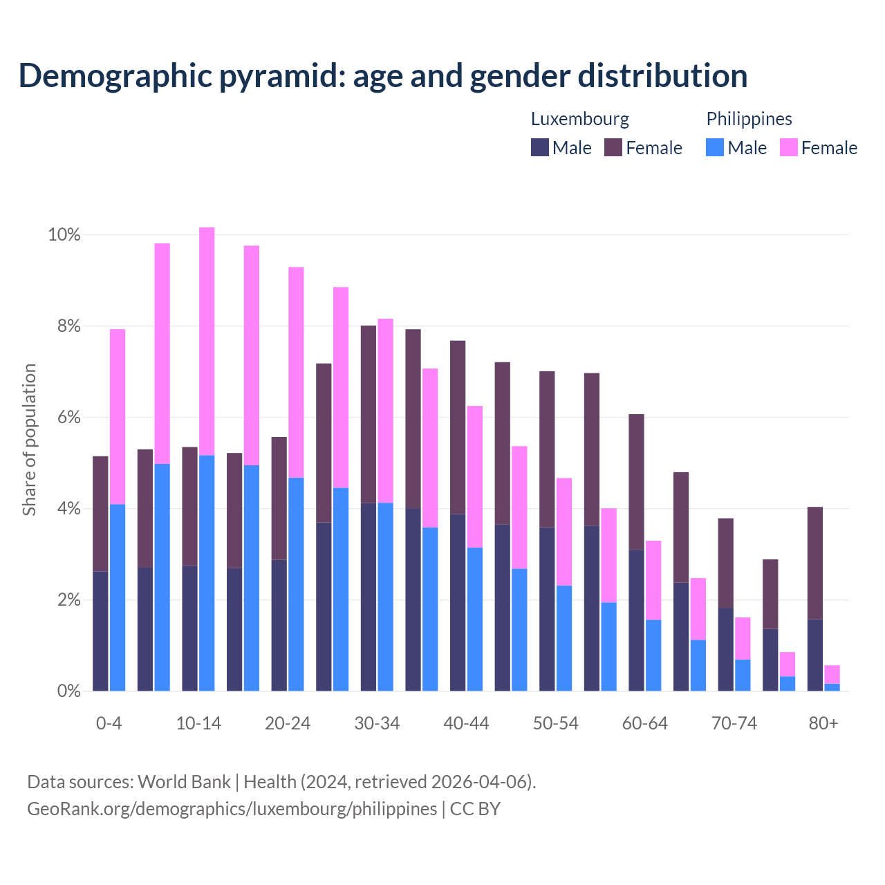 - The share of young demographic (0-15 years old) in Luxembourg is 15.8% vs 27.9% in the Philippines.