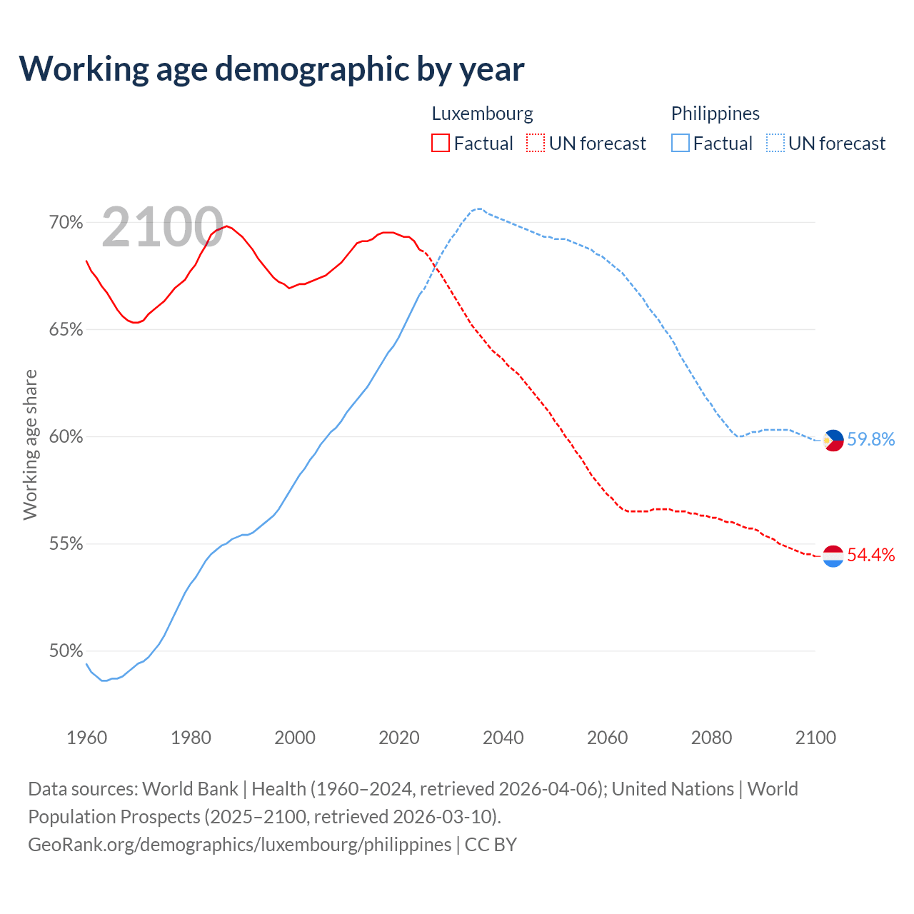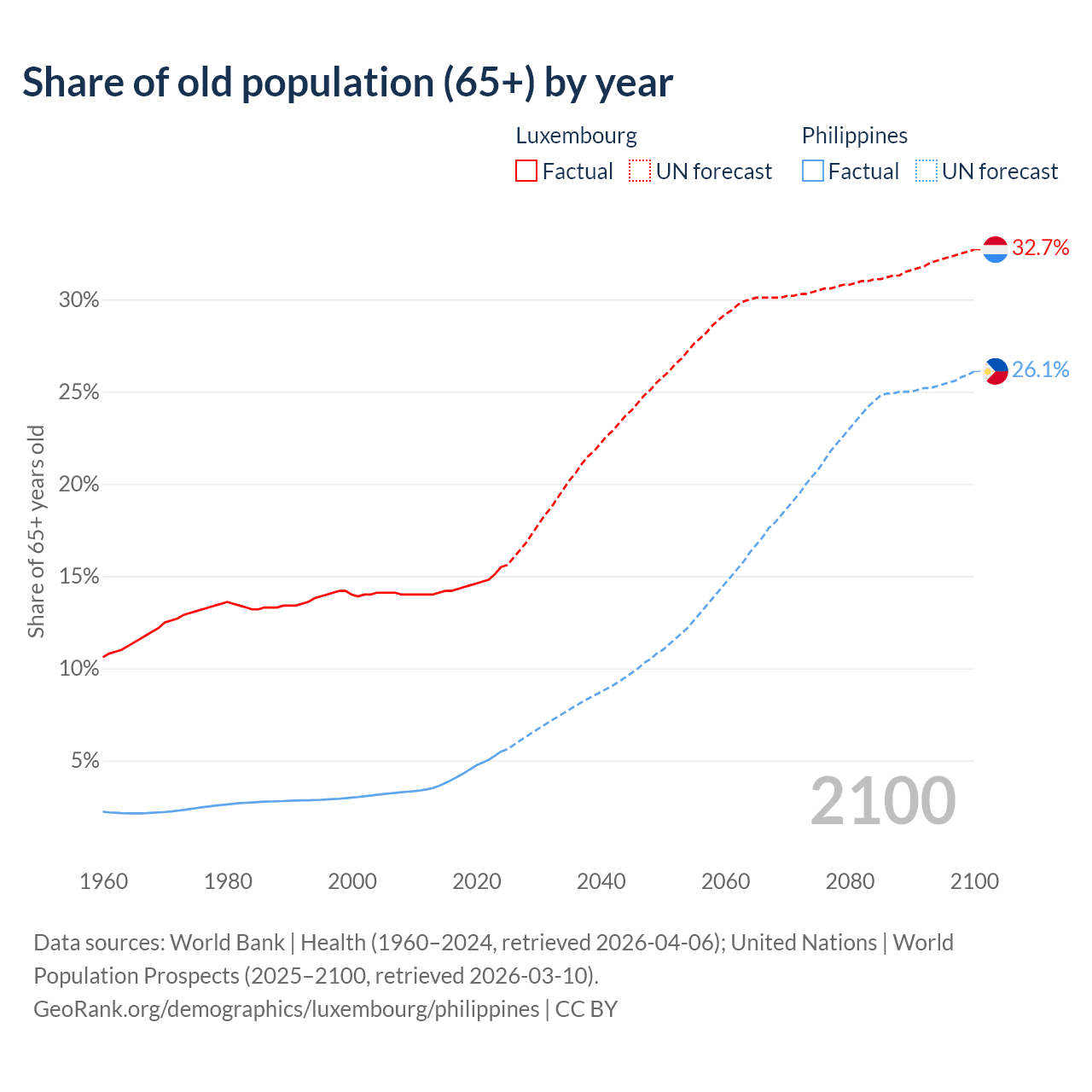 Median age Luxembourg vs Philippines, 1960-2100