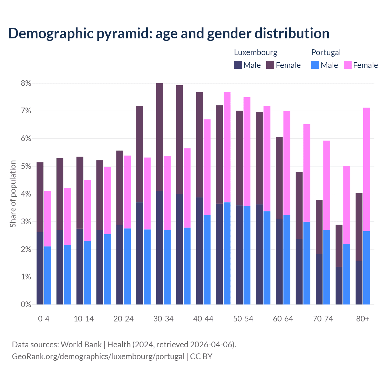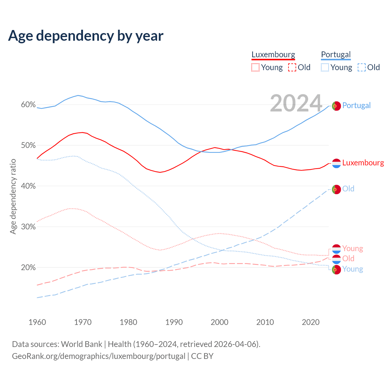 - Luxembourg is ranked 46/196 by median age (oldest to youngest) vs 5/196 for Portugal.